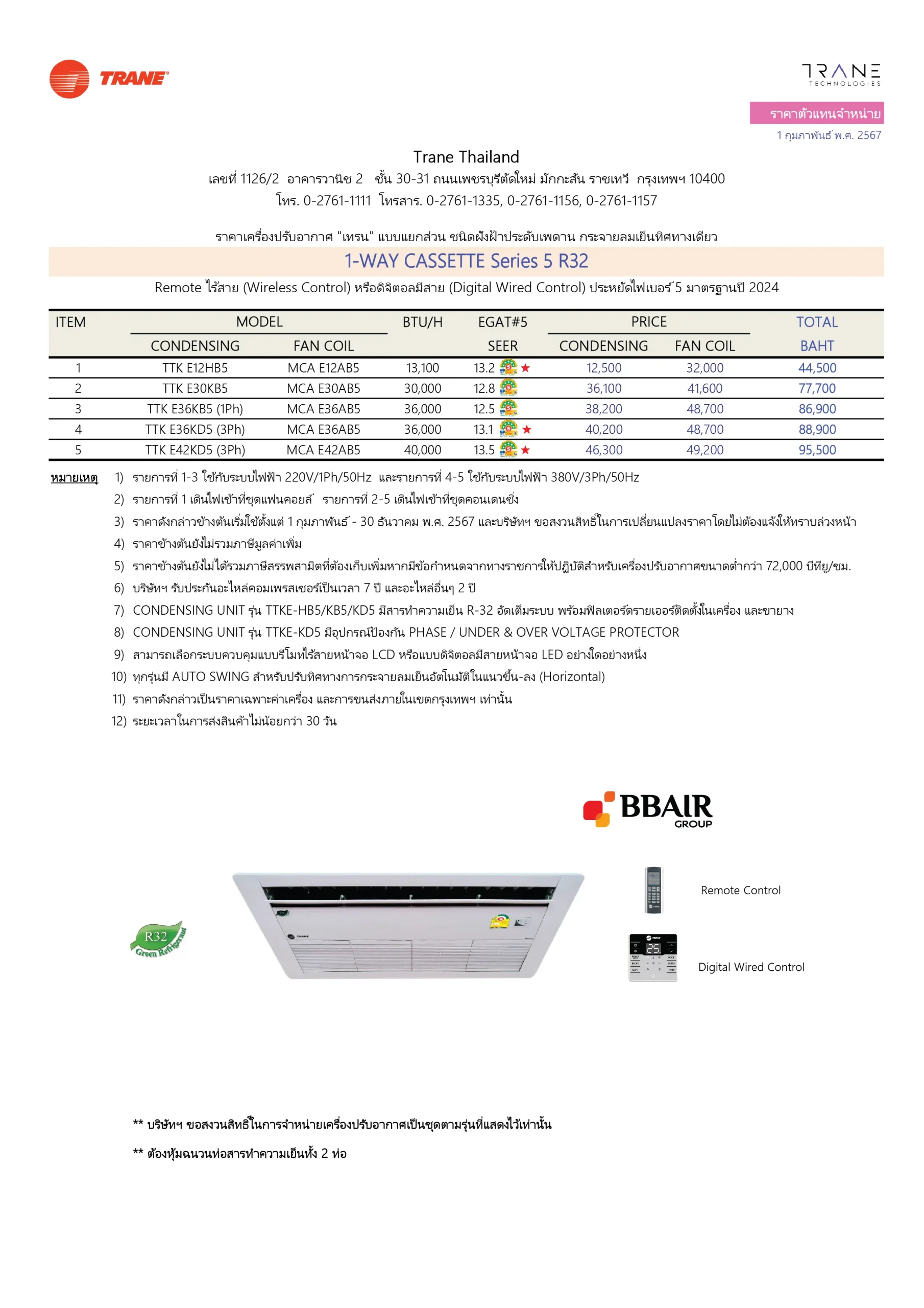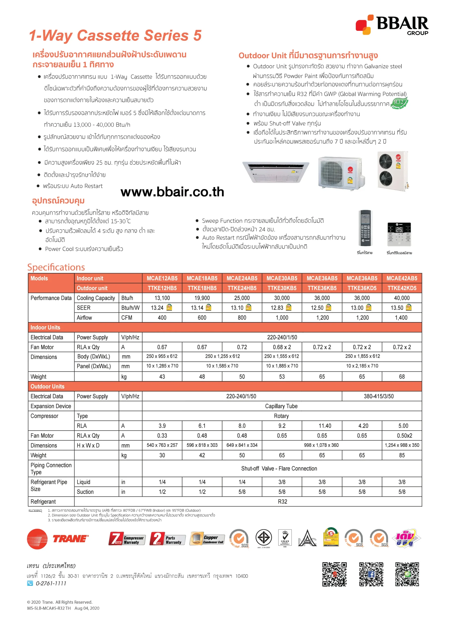 คุณสมบัติสินค้าของแอร์เทรน แบบ 1 ทิศทาง เบอร์ 5 1-WAY CASSETTE SERIES 5 น้ำยาแอร์ R-32