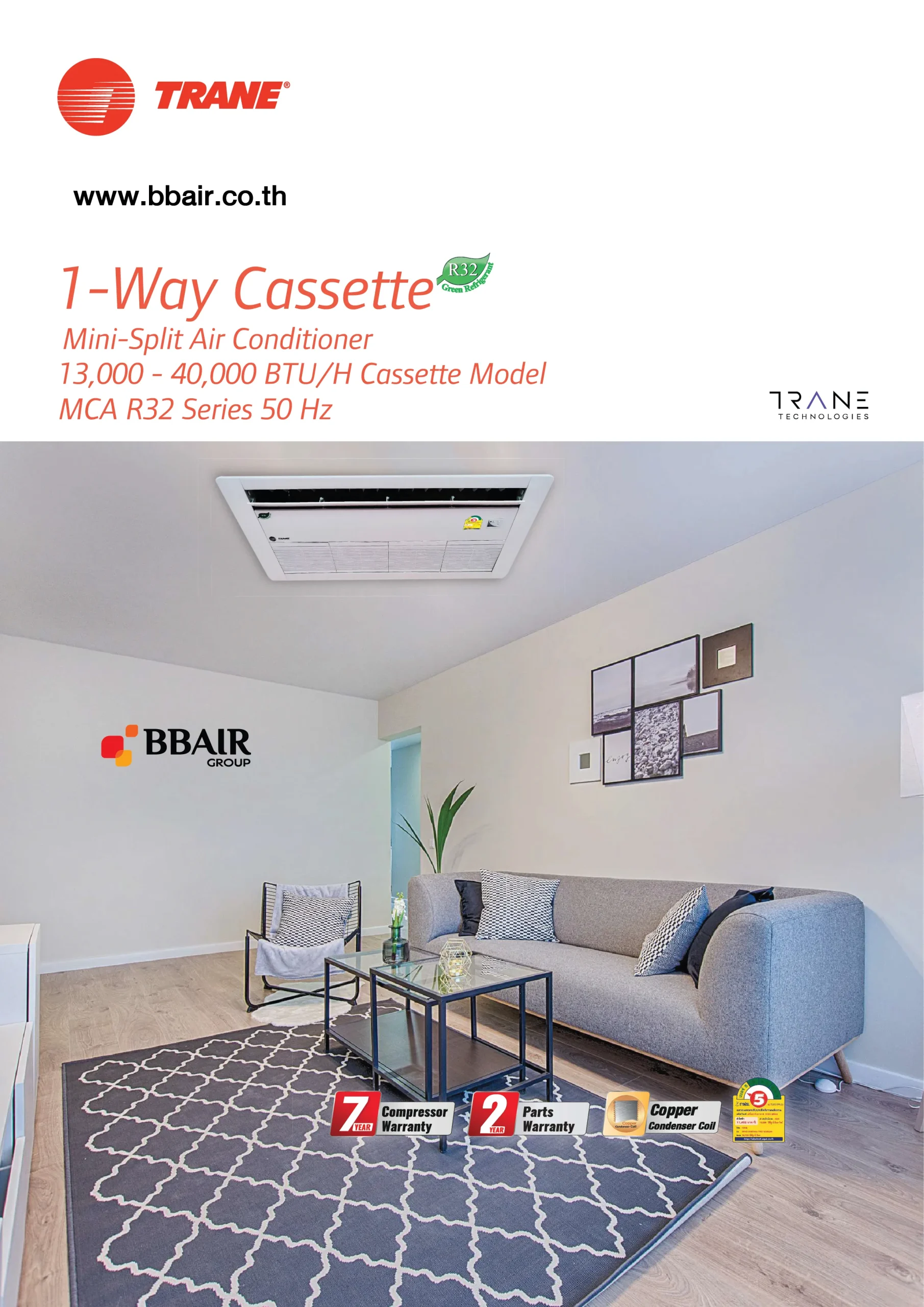 คุณสมบัติสินค้าของแอร์เทรน แบบ 1 ทิศทาง เบอร์ 5 1-WAY CASSETTE SERIES 5 น้ำยาแอร์ R-32