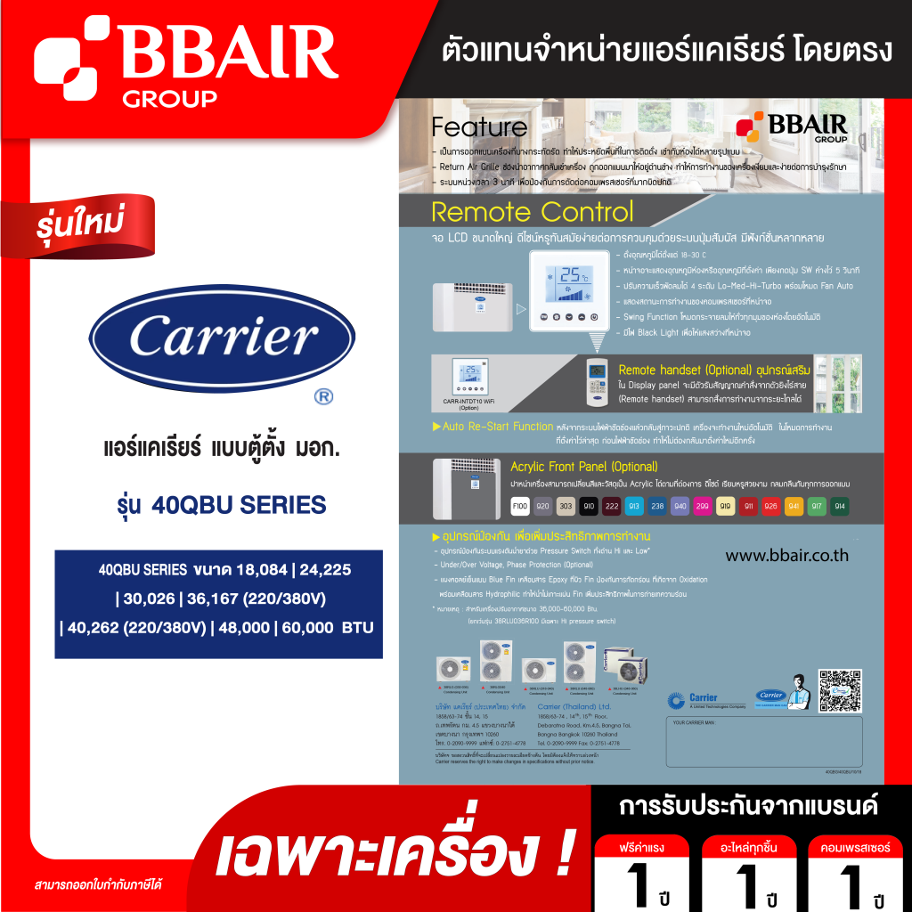 • แอร์แคเรียร์ Carrier แบบตู้ตั้ง 40QBU SERIES รุ่น 40QBU018X-10/38RLU018S101 (220 V) ขนาด 18,084 BTU (R-410A) รีโมทมีสาย
