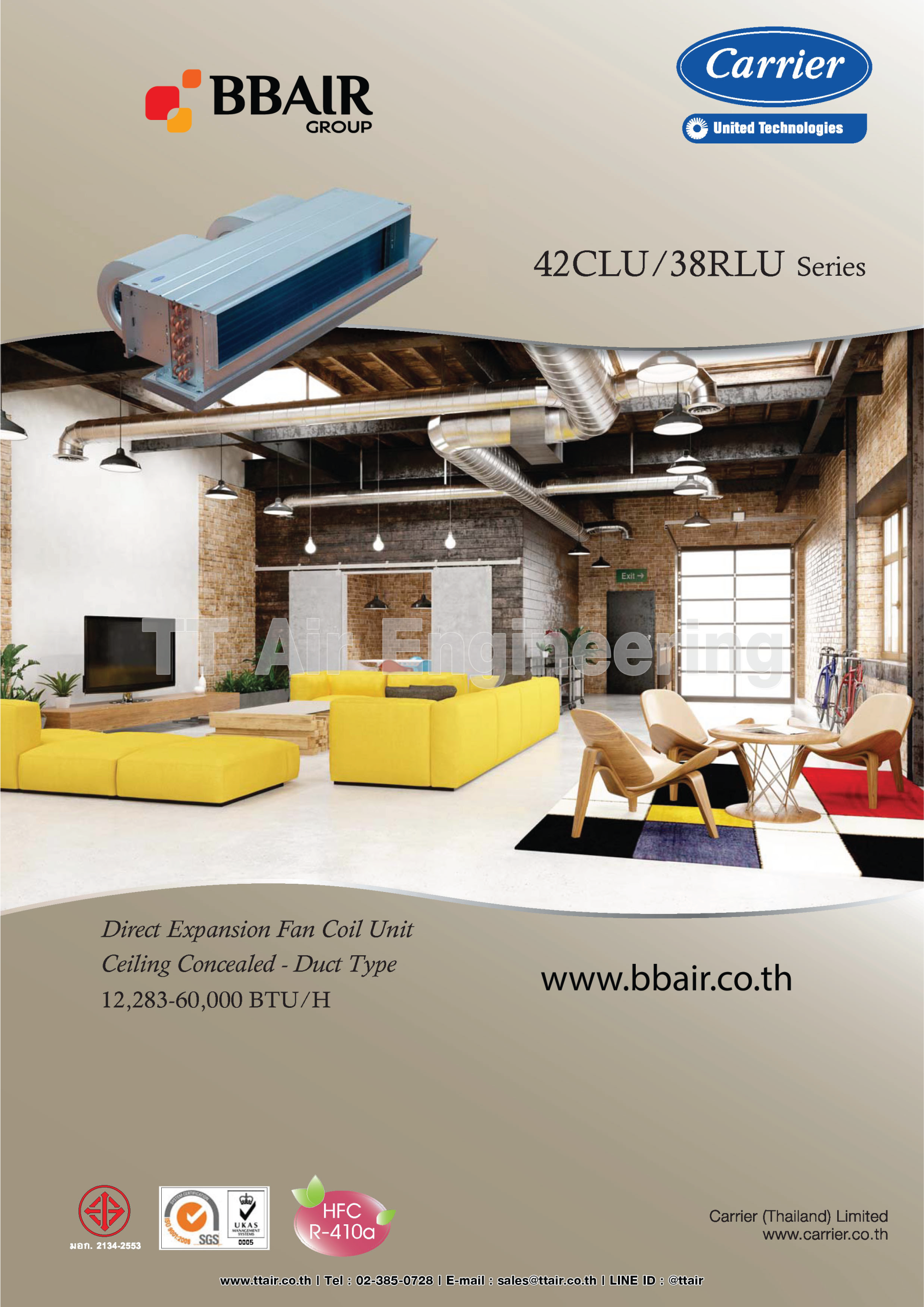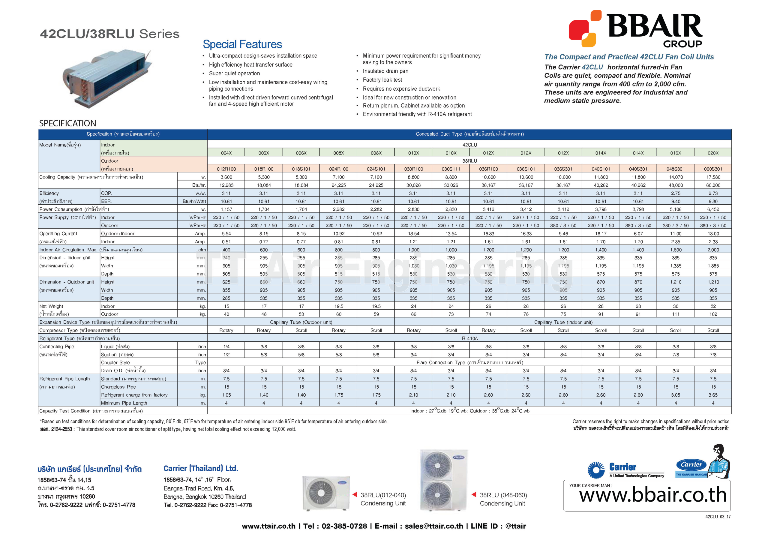 คุณสมบัติสินค้าของแอร์แคเรียร์ แบบเปลือยท่อลม FIX-SPEED 42CLU SERIES น้ำยาแอร์ R-410A