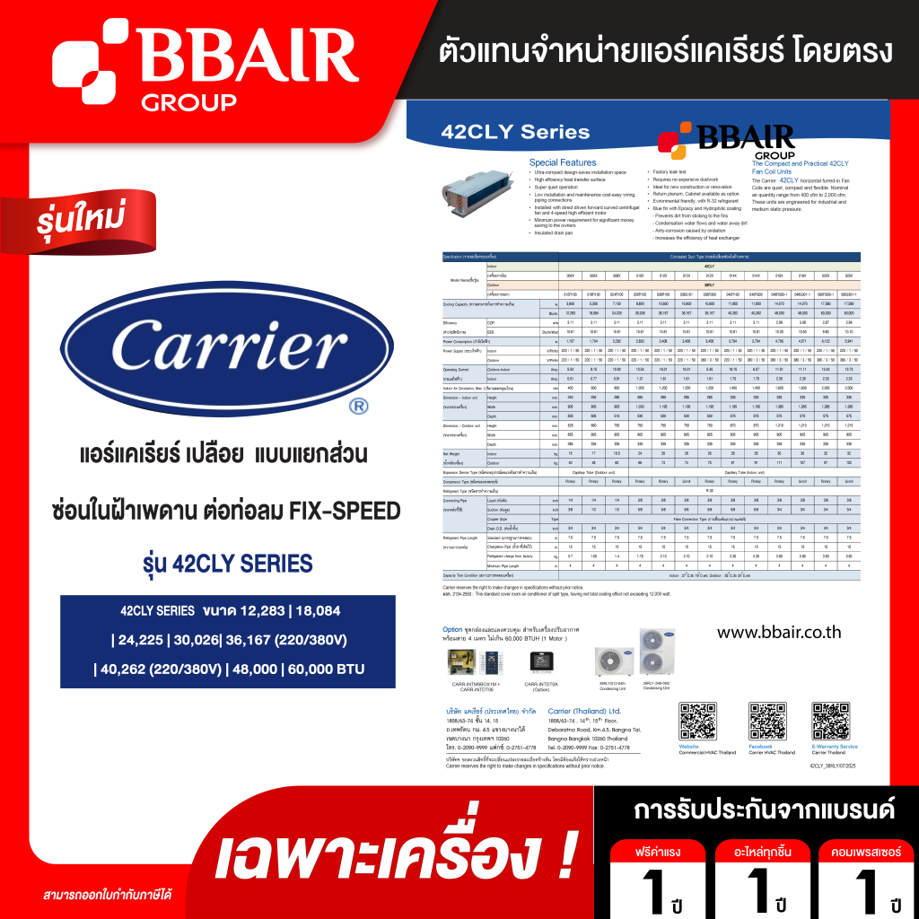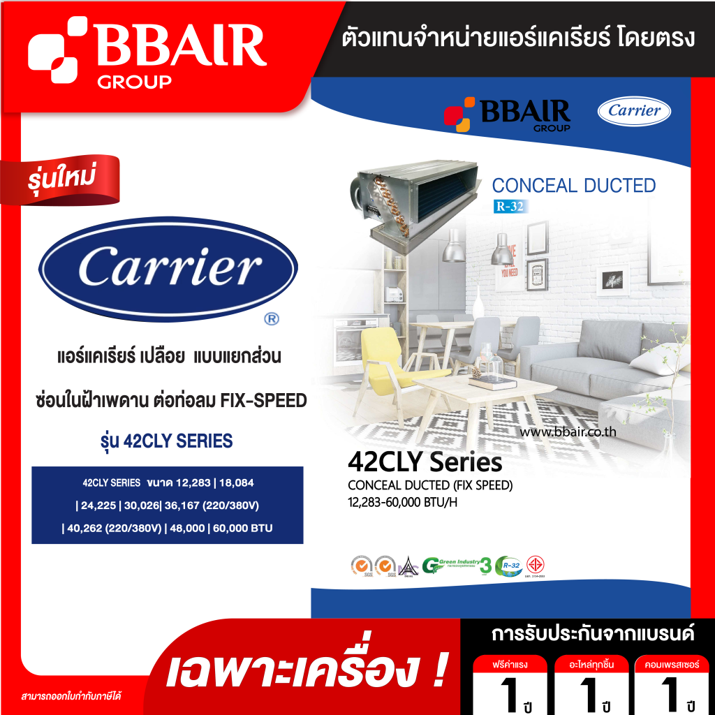 คุณสมบัติสินค้าของแอร์แคเรียร์ แบบเปลือยท่อลม 42CLY SERIES น้ำยาแอร์ R-32