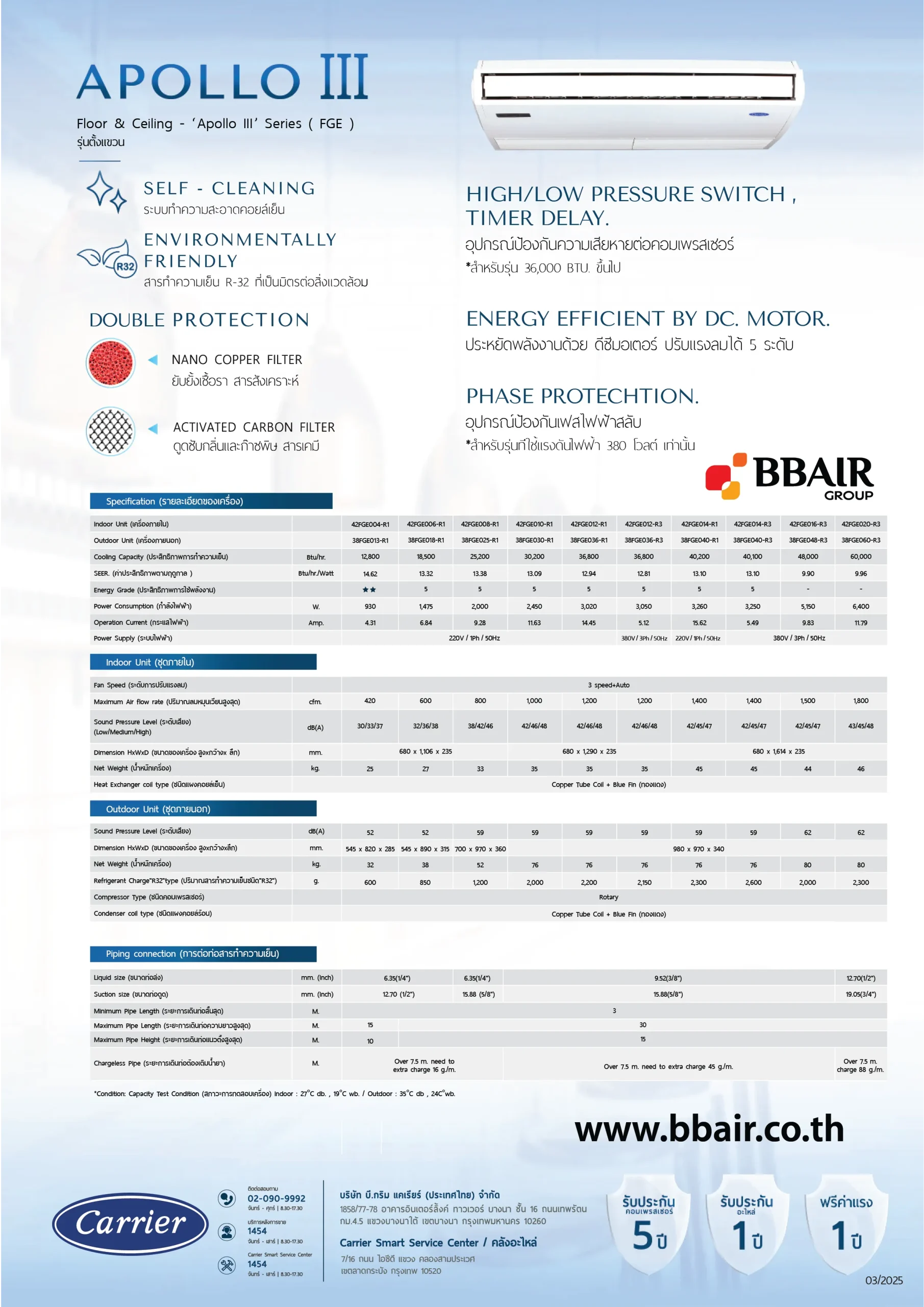 คุณสมบัติสินค้าของแอร์แคเรียร์ แบบแขวนเบอร์ 5 AOLLO III SERIE น้ำยาแอร์ R-32