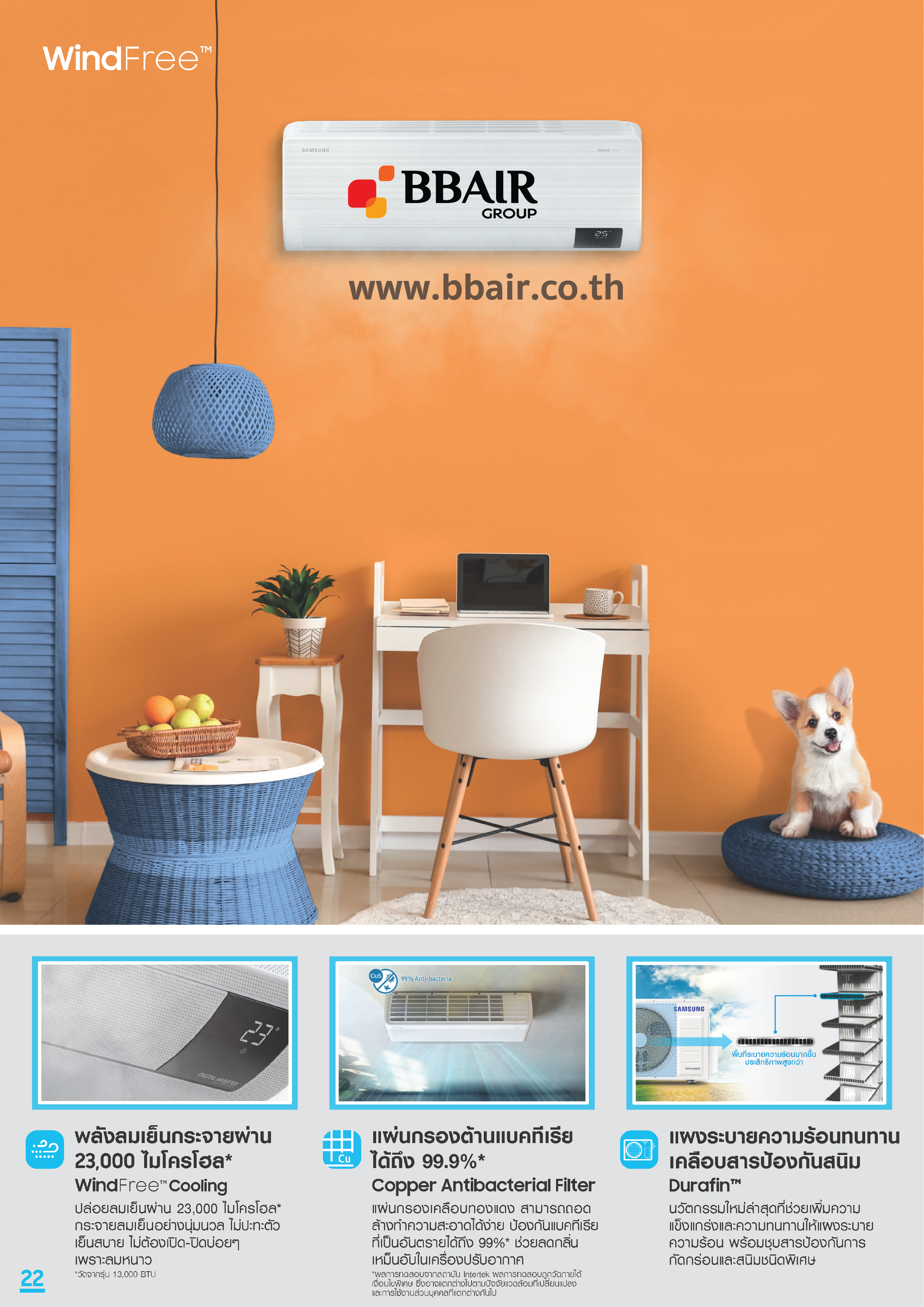 ** ทดสอบกับเครื่องปรับอากาศซัมซุงรุ่น AR12TXCAAWKNEU โหมด WindFree™ สร้างเสียงรบกวนเพียง 23dB เมื่อเทียบกับ 26dB กับรุ่นทั่วไปของเครื่องปรับอากาศซัมซุง