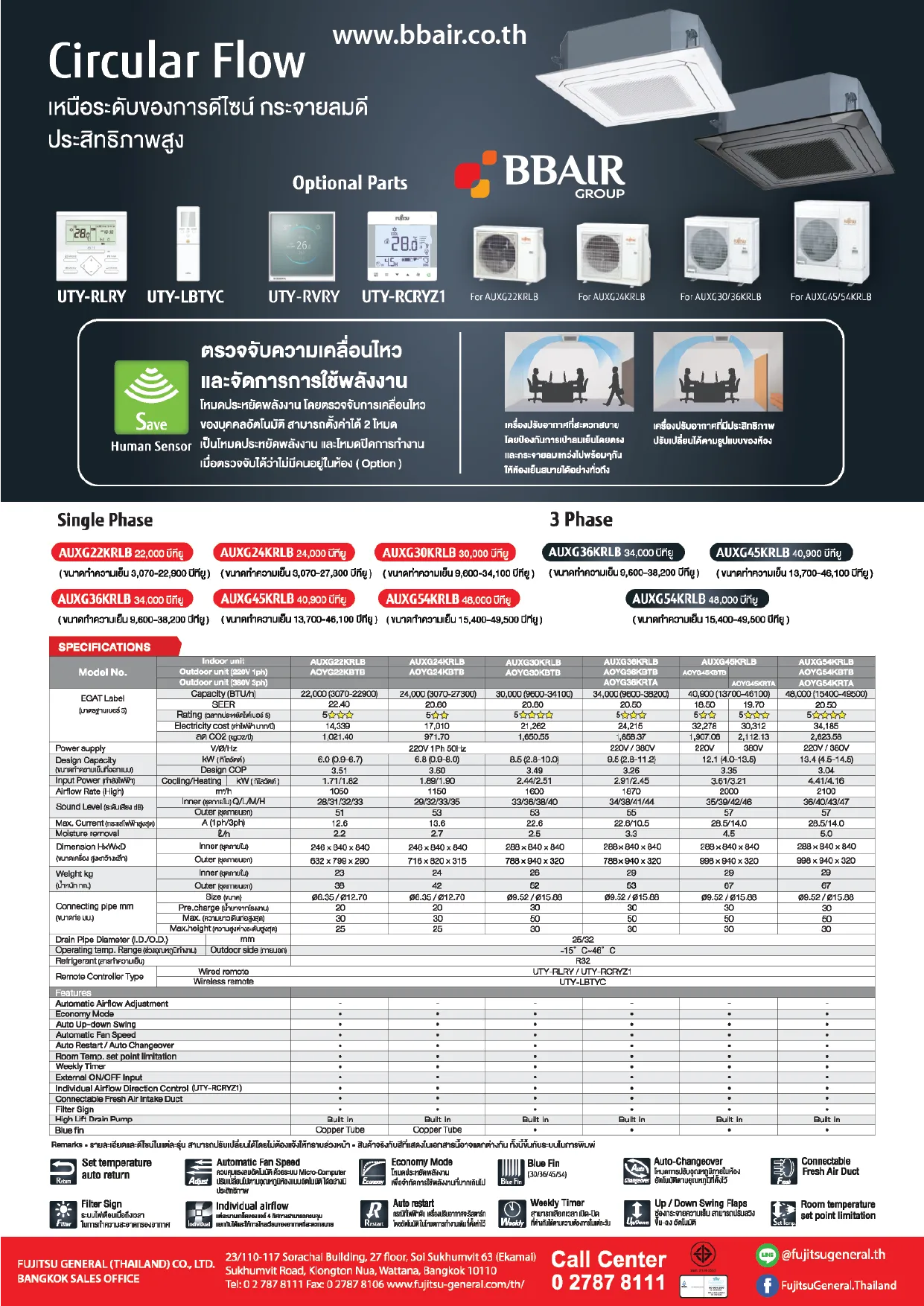 โหมดประหยัดพลังงาน โดยตรวจจับการเคลื่อนไหว จองบุคคลอัตโนมัติ สามารถตั้งค่าได้ 2 โหมด Human Sensor เป็นโหมดประหยัดพลังงาน และโหมดปิดการทํางาน เบื่อตรวจจับได้ว่าไม่มีคนอยู่ในห้อง (Option)