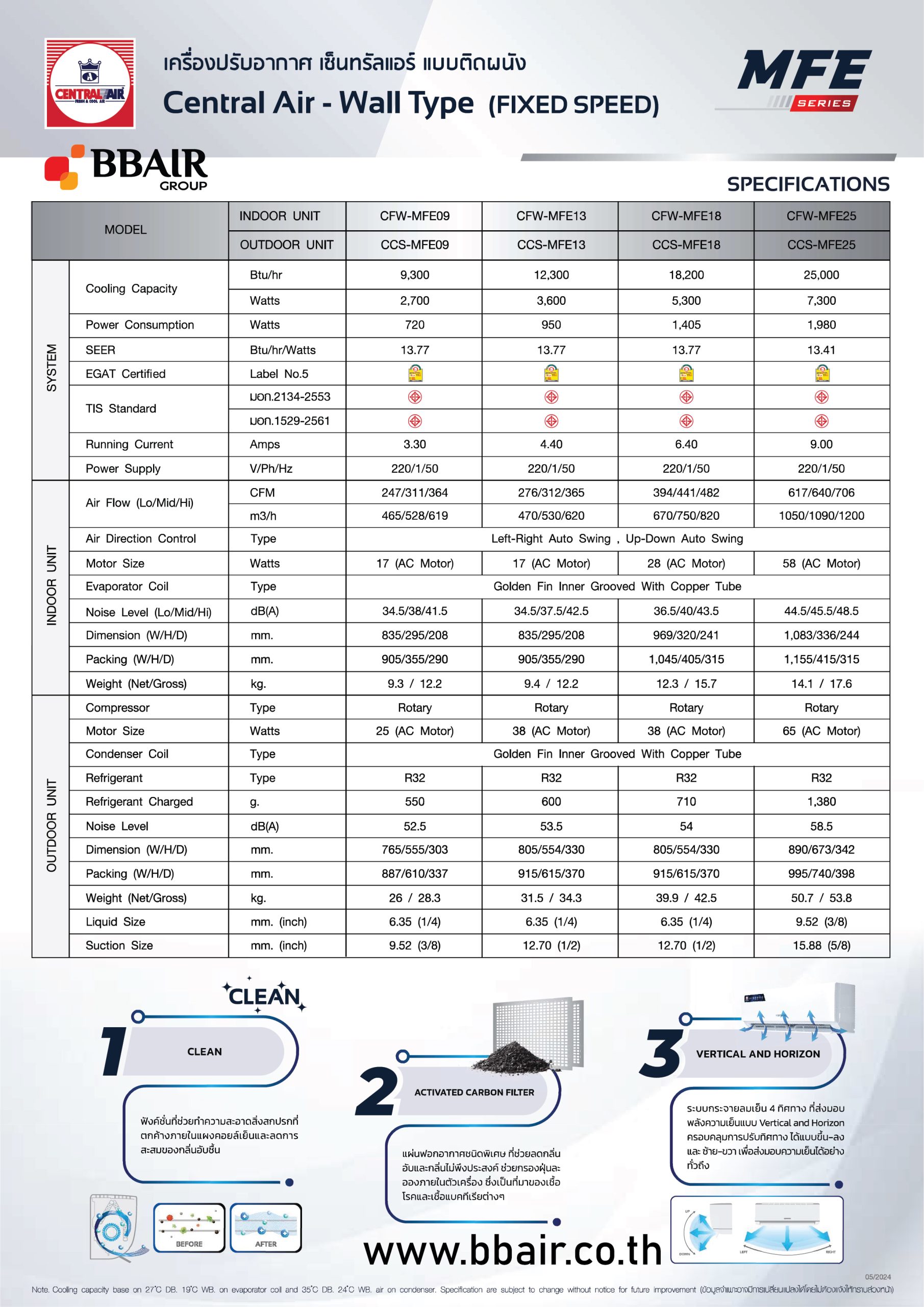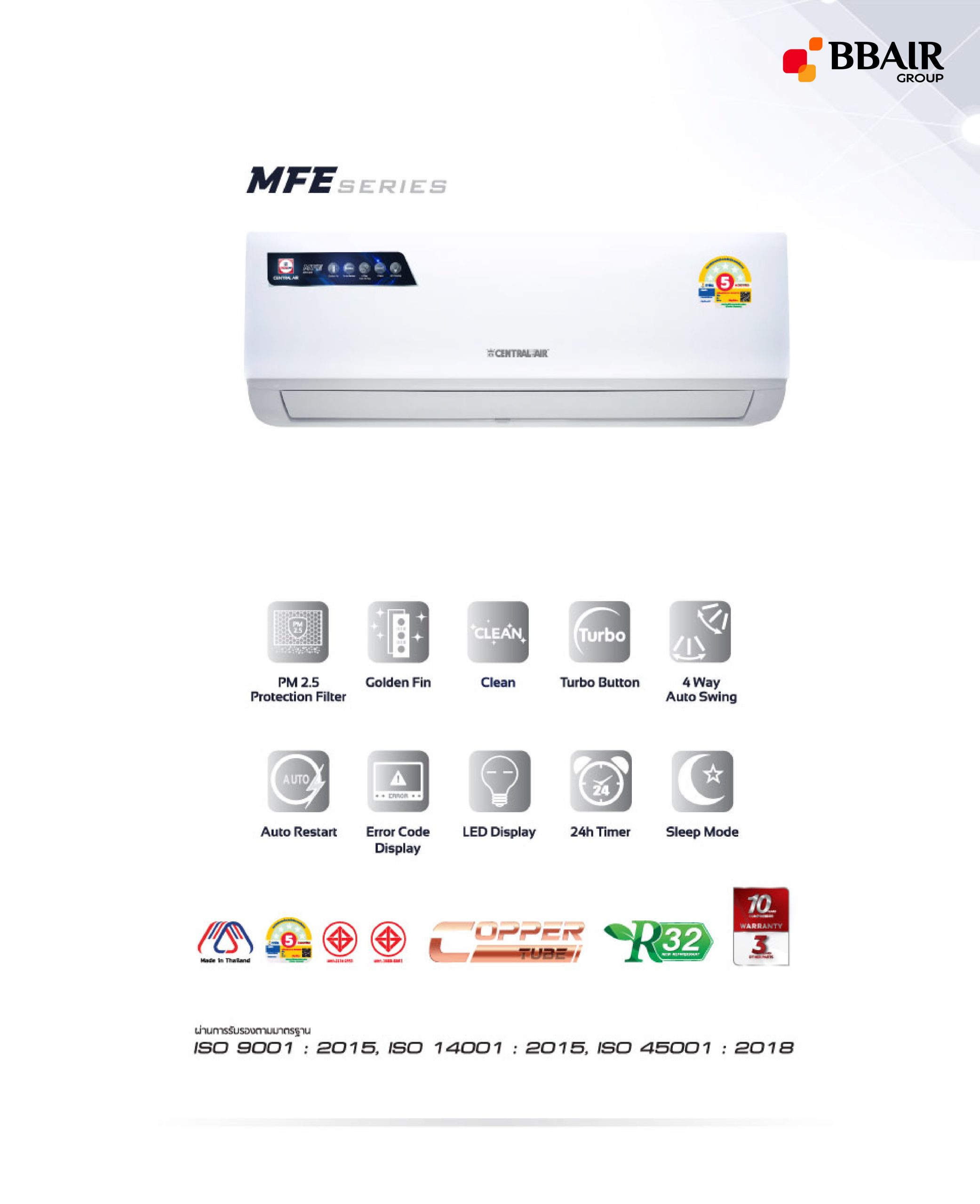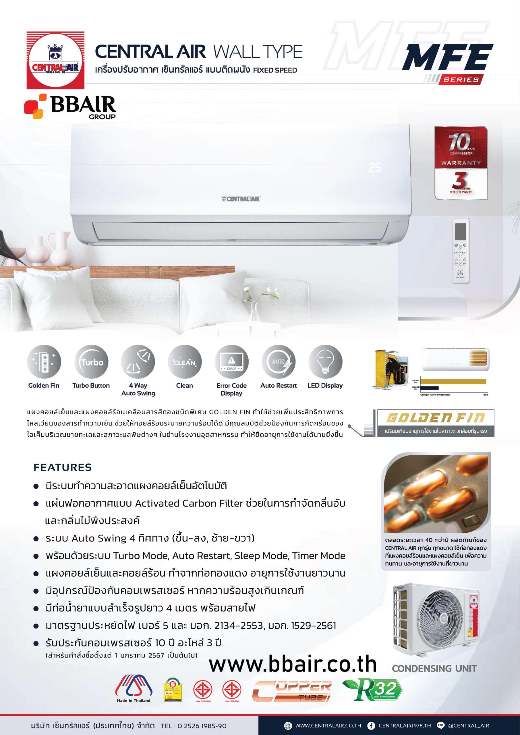คุณสมบัติสินค้าของเซ็นทรัลแอร์ CENTRAL AIR แบบติดผนัง ประหยัดไฟ เบอร์ 5 FIXSPEED CFW-MFE SERIES  น้ำยาแอร์ R-32
