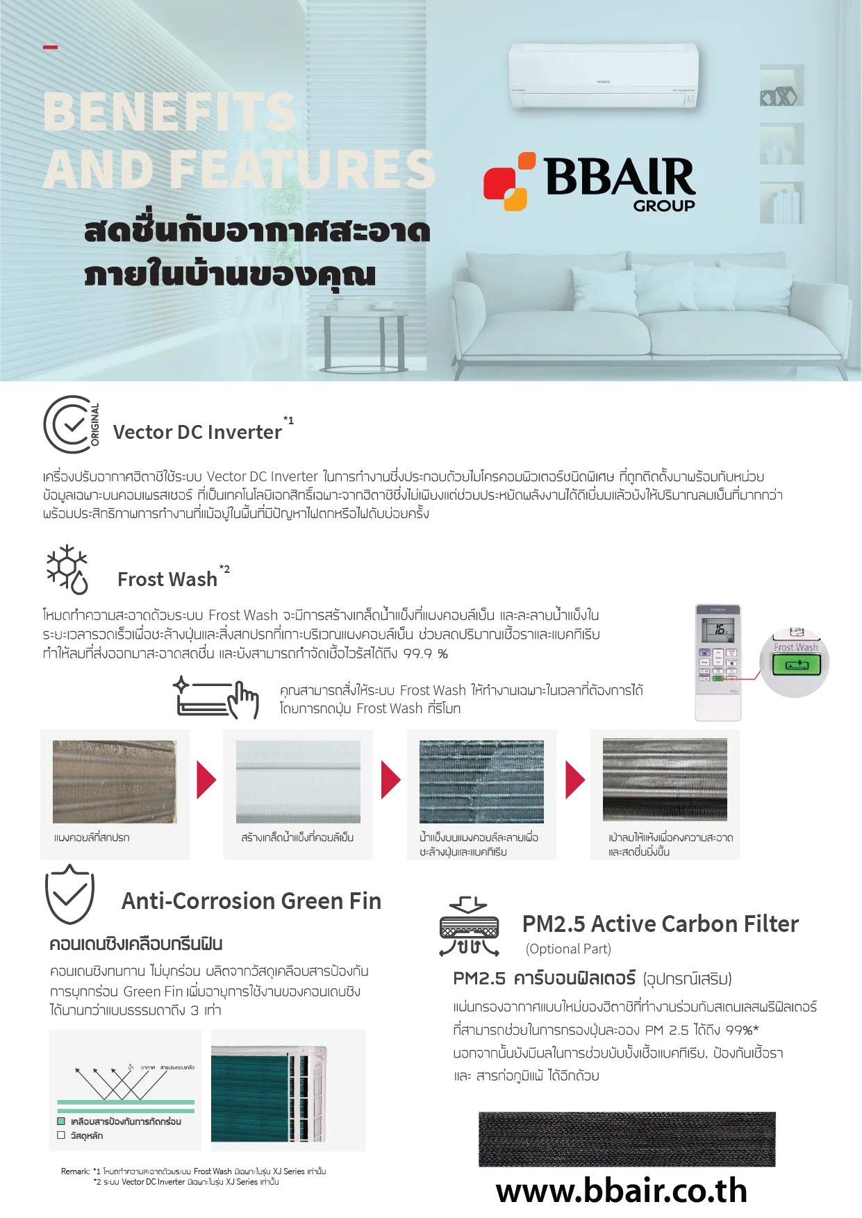โหมดทําความสะอาดด้วยระบบ Frost Wash จะมีการสร้างเกล็ดน้ําแข็งที่แผงคอยล์เย็น และละลายนํ้าแข็งใน ระยะเวลารวดเร็วเพื่อชะล้างฝุ่นและสิ่งสกปรกที่เกาะบริเวณแผงคอยล์เย็น ช่วยลดปริมาณเชื้อราและแบคทีเรีย