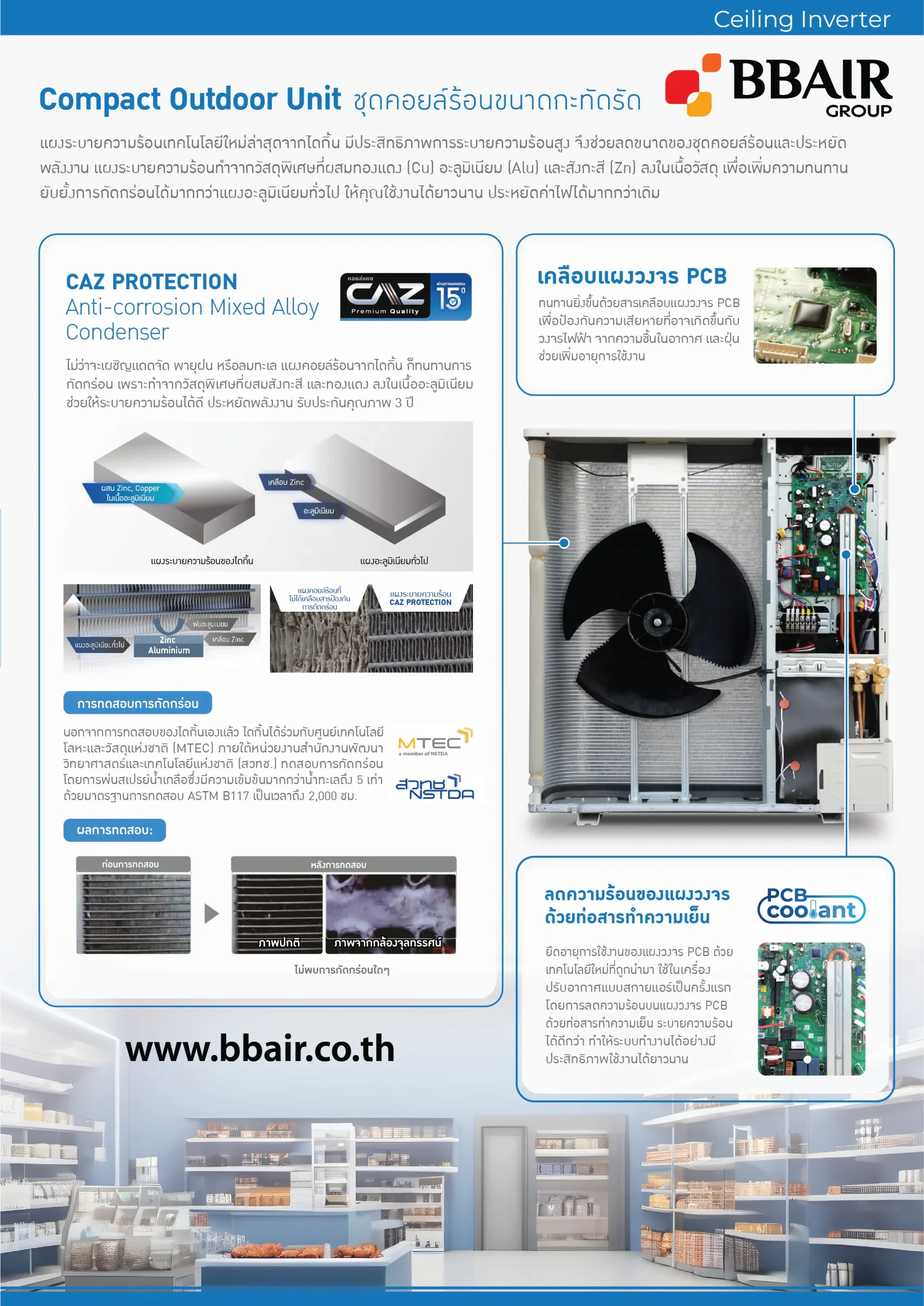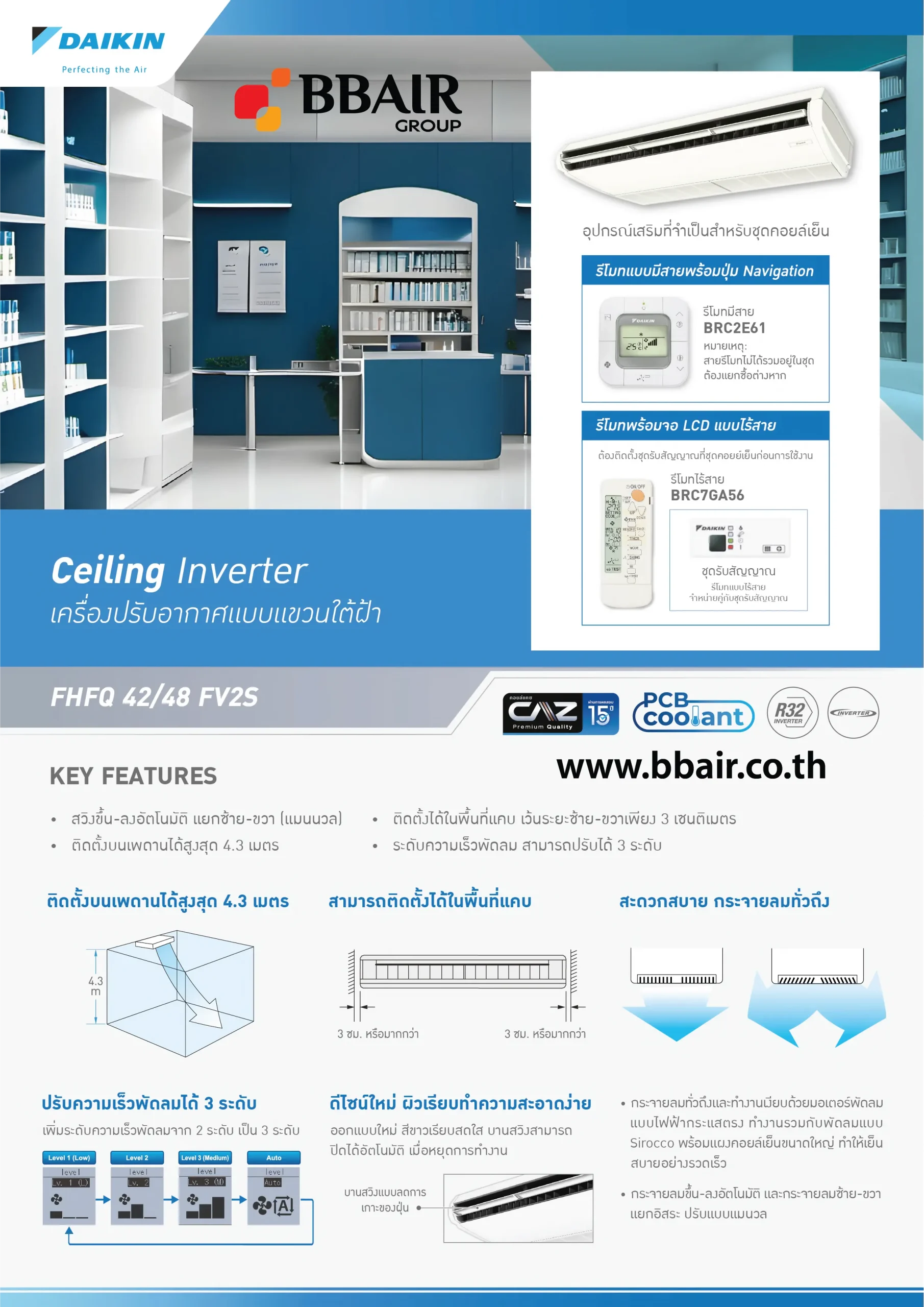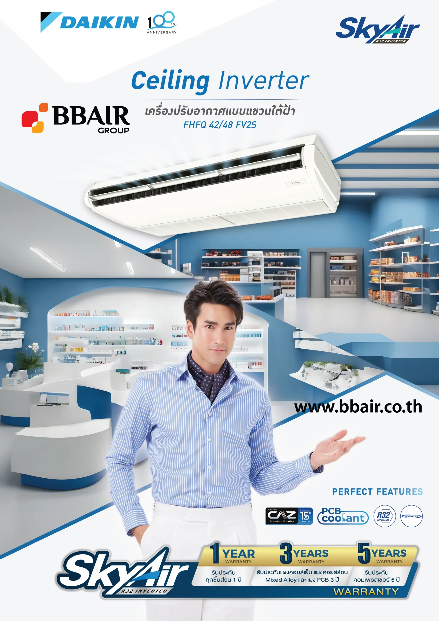 เครื่องปรับอากาศแบบแขวนใต้ฝ้า (Ceiling)ด้วยระบบอินเวอร์เตอร์แบบสวิงที่ให้ความเย็นเร็วและคงที่ ลดการตัดของคอมเพรสเซอร์ ใช้สารทำความเย็น R32 ให้ประสิทธิภาพติดตั้งได้แม้ในพื้นที่แคบโดยเว้นระยะซ้าย-ขวาเพียง 3 ซม.