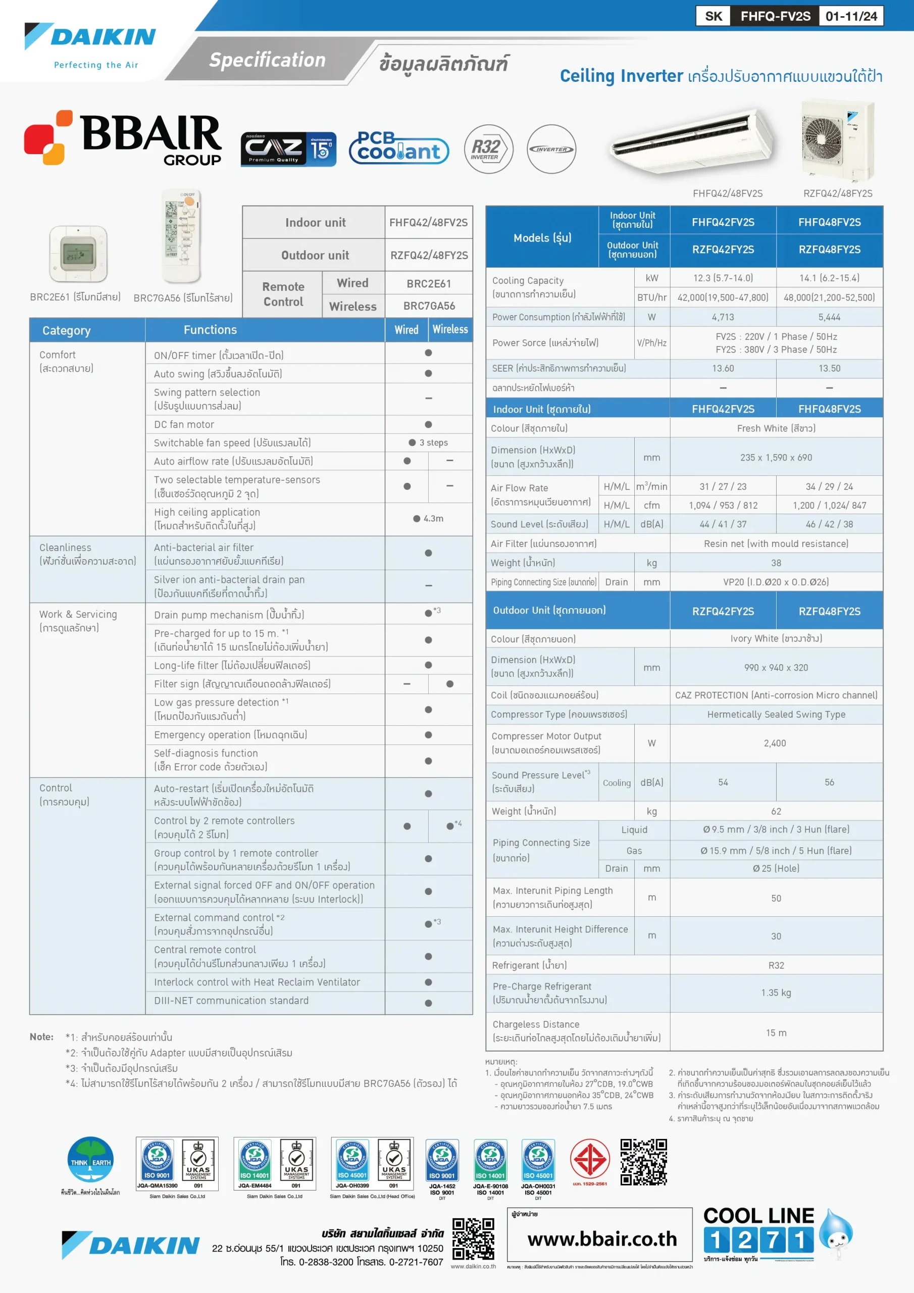 คุณสมบัติสินค้าของแอร์ไดกิ้น แบบแขวนอินเวอร์เตอร์ FHFQ-FV น้ำยาแอร์ R-32
