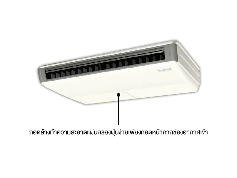 เครื่องปรับอากาศแบบแขวนใต้ฝ้า (Ceiling) ใช้สารทำความเย็น R410A ให้ประสิทธิภาพการทำความเย็นสูงและไม่ทำลายชั้นบรรยากาศ กำลังลมแรง แขวนใต้ฝ้าได้สูงสุดถึง 3.5 เมตร มีแผ่นกรองอากาศเคลือบสารยับยั้งแบคทีเรียเพื่อสุขภาพที่ดี ติดตั้งง่ายบางสุดเพียง 195 มม. ติดตั้งได้แม้ในพื้นที่แคบ ทนทานด้วยแผงระบายความร้อนที่ชุดคอยล์ร้อนเคลีอบสารป้องกันการกัดกร่อน ใช้งานได้ยาวนาน