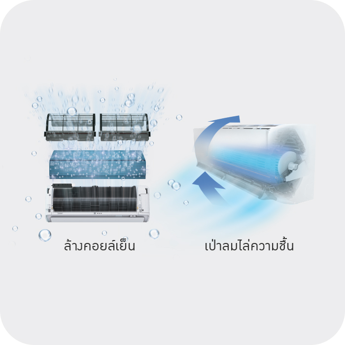 ระบบทำความสะอาดตัวเองด้วยการล้าง Heat Exchanger โดยใช้การควบแน่นไอน้ำในอากาศในกลายเป็นหยดน้ำ ล้างทำความสะอาด Heat exchange จากนั้นเป่าไล่ความชื้นด้วยลมที่มีประจุอิเล็กตรอนไฟฟ้าจาก Streamer ที่ช่วยยับยั้งเชื้อโรค ลดการสะสมของแบคทีเรีย และเชื้อราซึ่งก่อให้เกิดกลิ่นอับ