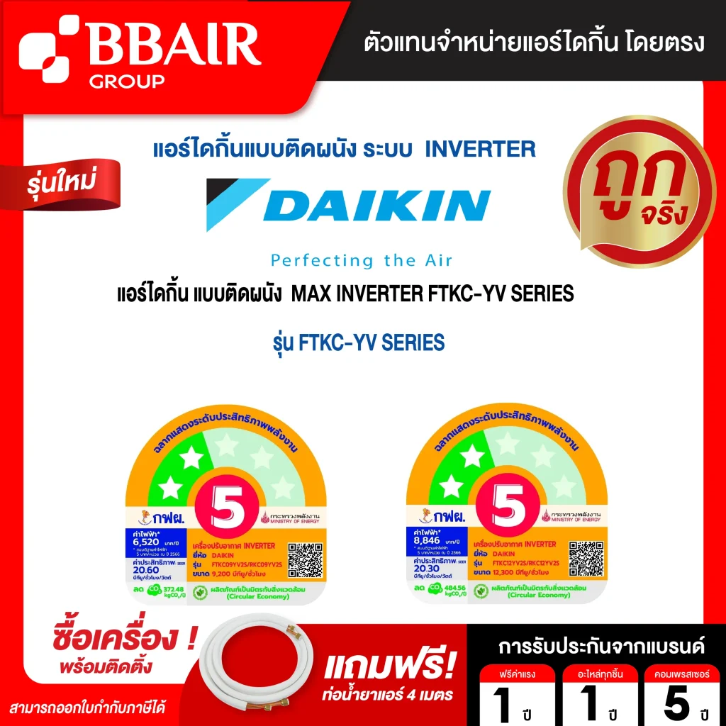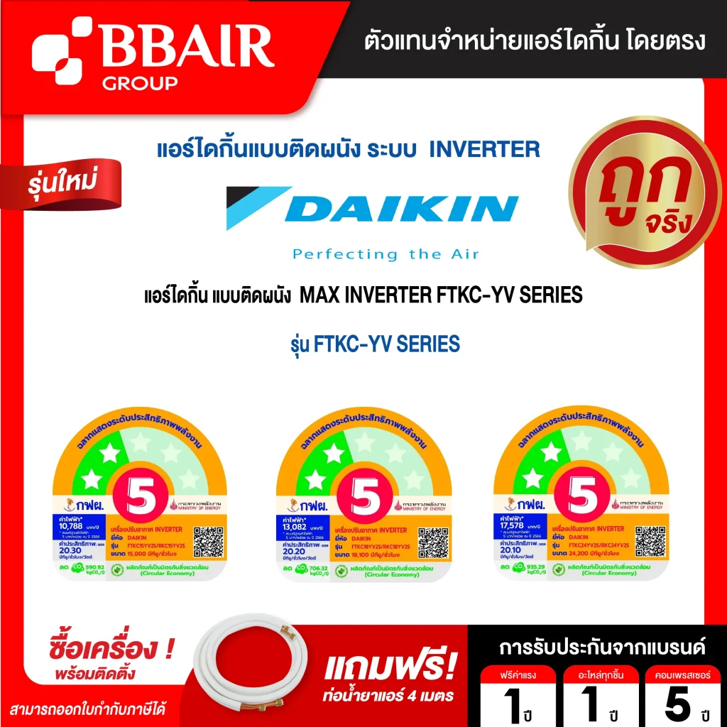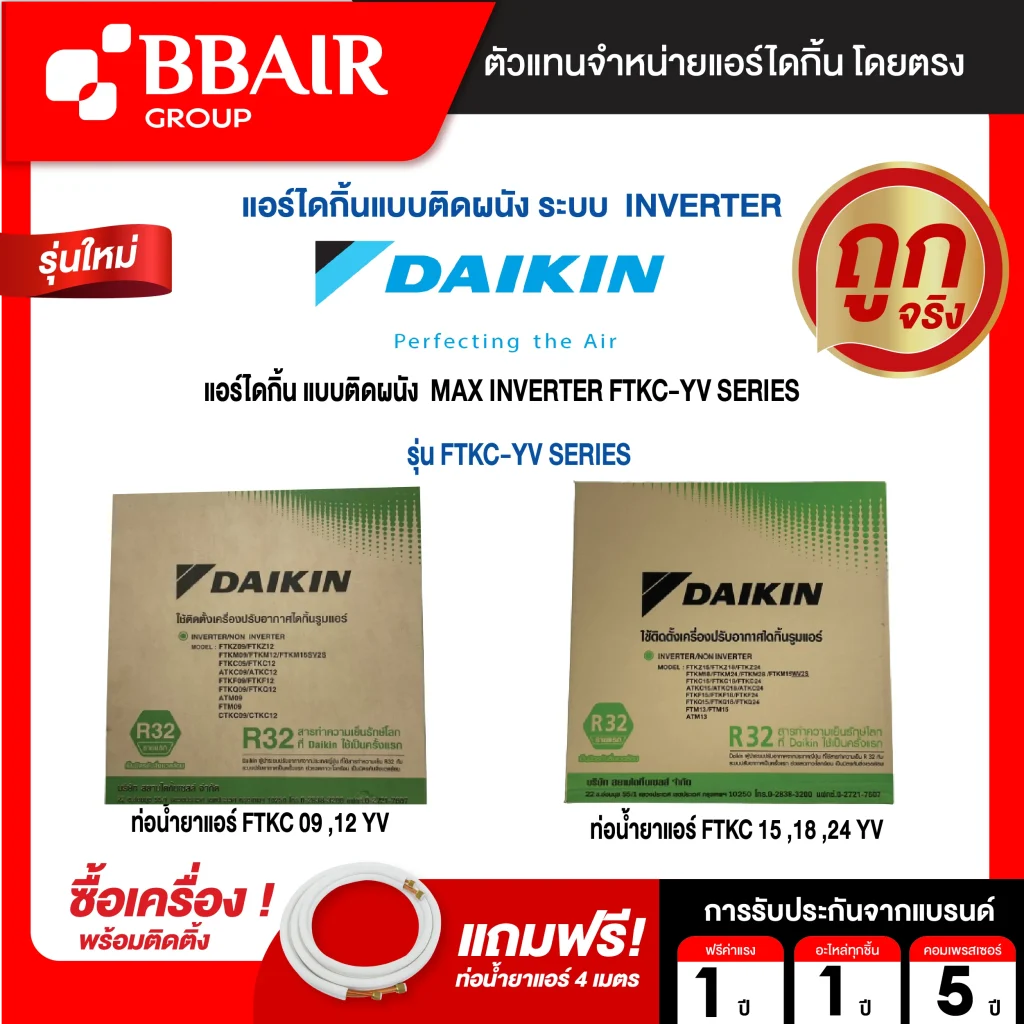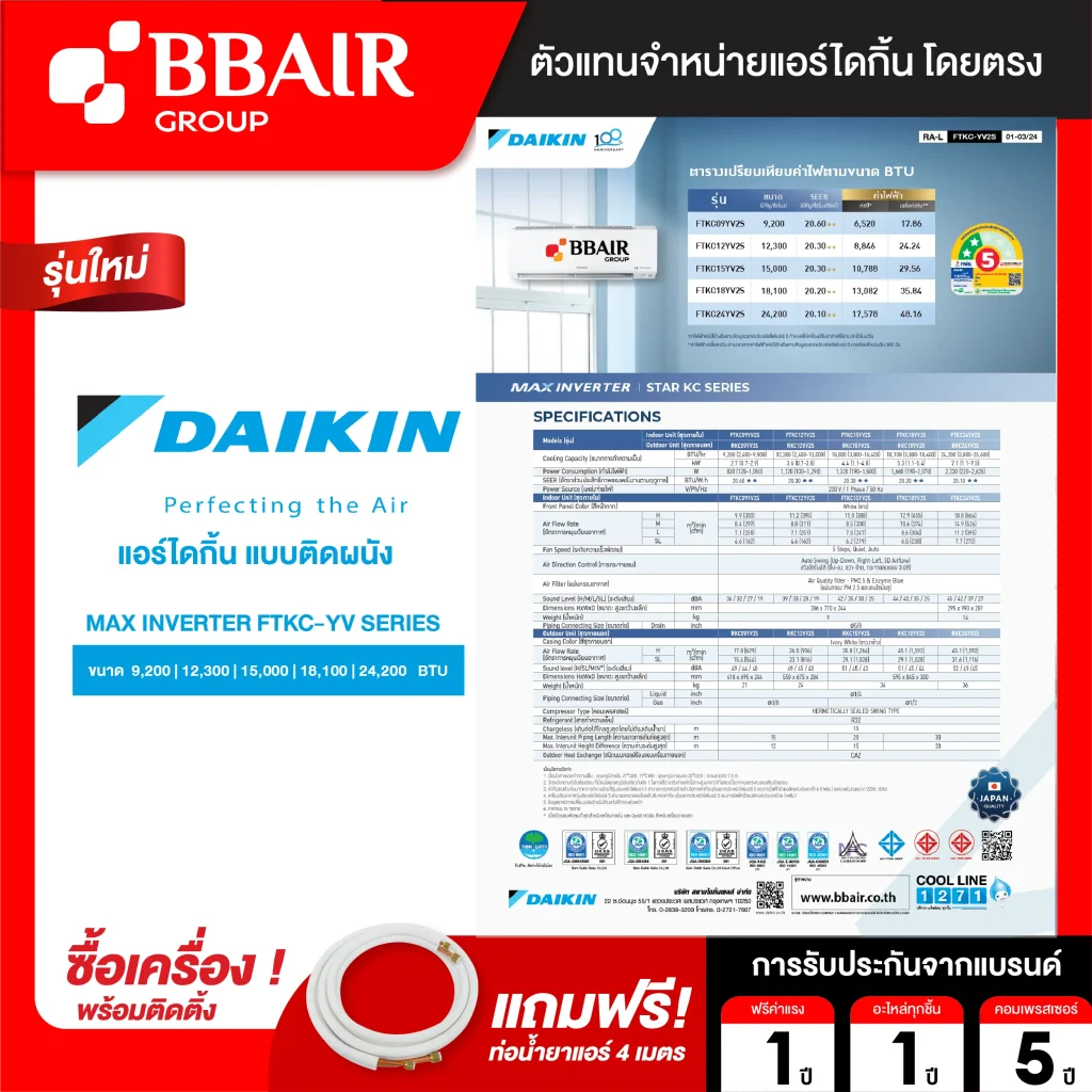 ขนาด 9,000 -24,000 BTU ส่วนเกินคิดเมตรละ 60 บาท