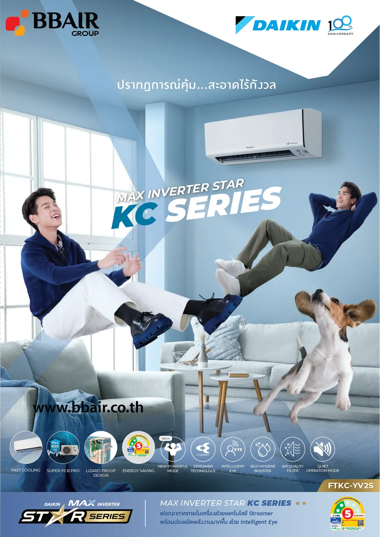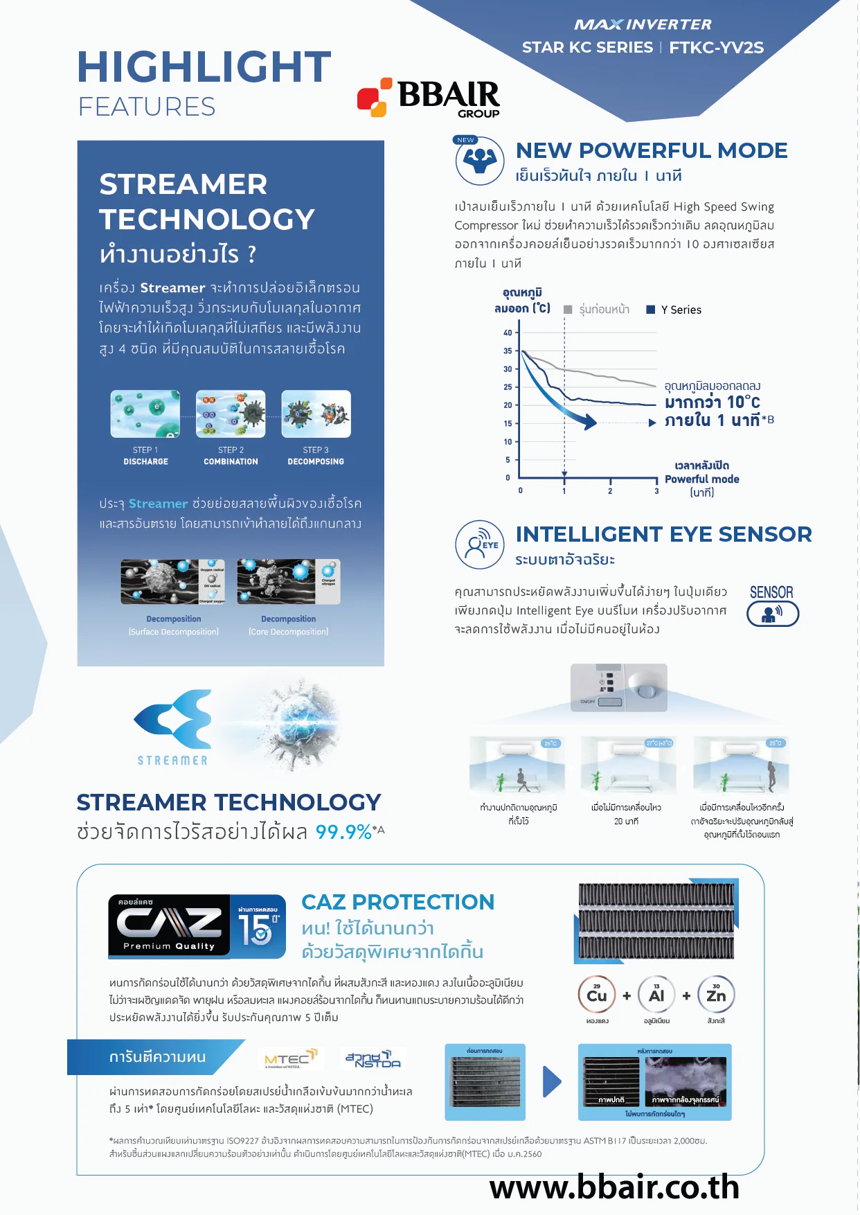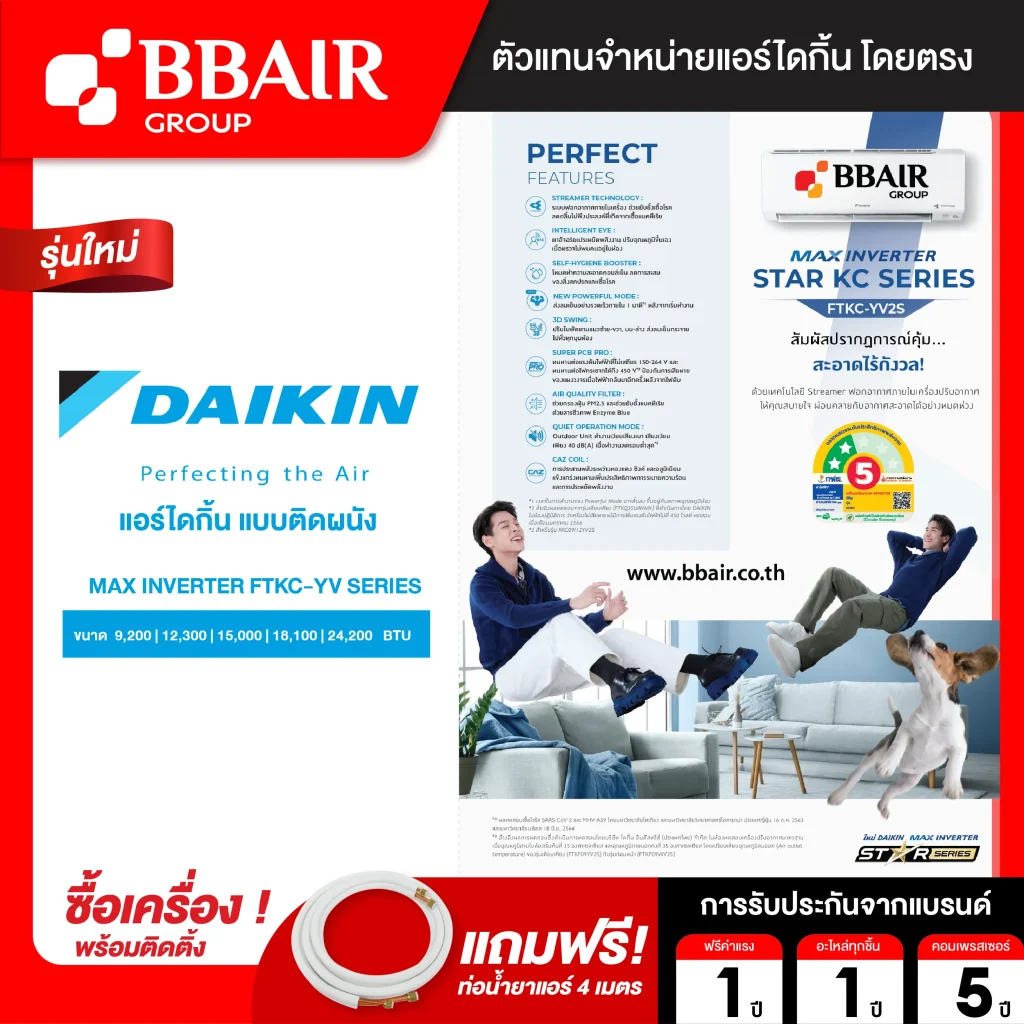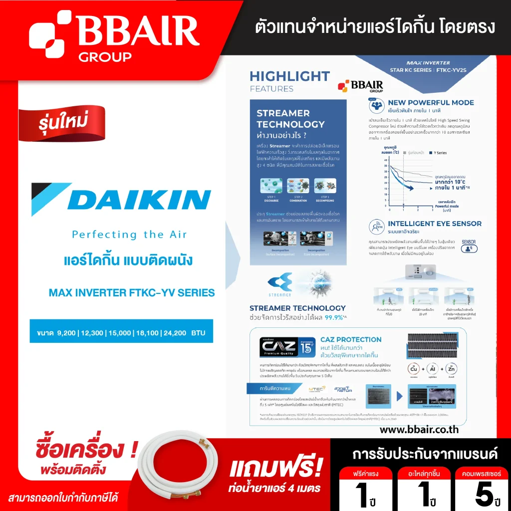 เครื่องปรับอากาศที่มาพร้อมฟังก์ชันฟอกอากาศ ด้วย Streamer Technology ประจุอิเล็กตรอนความเร็วสูงที่ช่วยยับยั้งเชื้อโรคและสสารอันตรายที่ผ่านเข้ามาในเครื่องปรับอากาศ มาพร้อมตาอัจฉริยะ ตรวจจับการเคลื่อนไหว ลดการใช้พลังงานเมื่อไม่มีคนอยู่ในห้อง ลดกลิ่นไม่พึงประสงค์จากเชื้อราและแบคทีเรียด้วยฟังก์ชันทำความสะอาดตัวเอง เย็นเร็วทันใจใน 1 นาทีด้วย powerful mode ใหม่ กระจายลมเย็นทุกมุมห้องด้วยบานสวิงขึ้น-ลง ซ้าย-ขวา ประหยัดค่าไฟด้วยค่าประหยัดพลังงานเบอร์ 5 ระดับ 2 ดาว มอบประสบการณ์คุ้ม..สะอาดไร้กังวล
