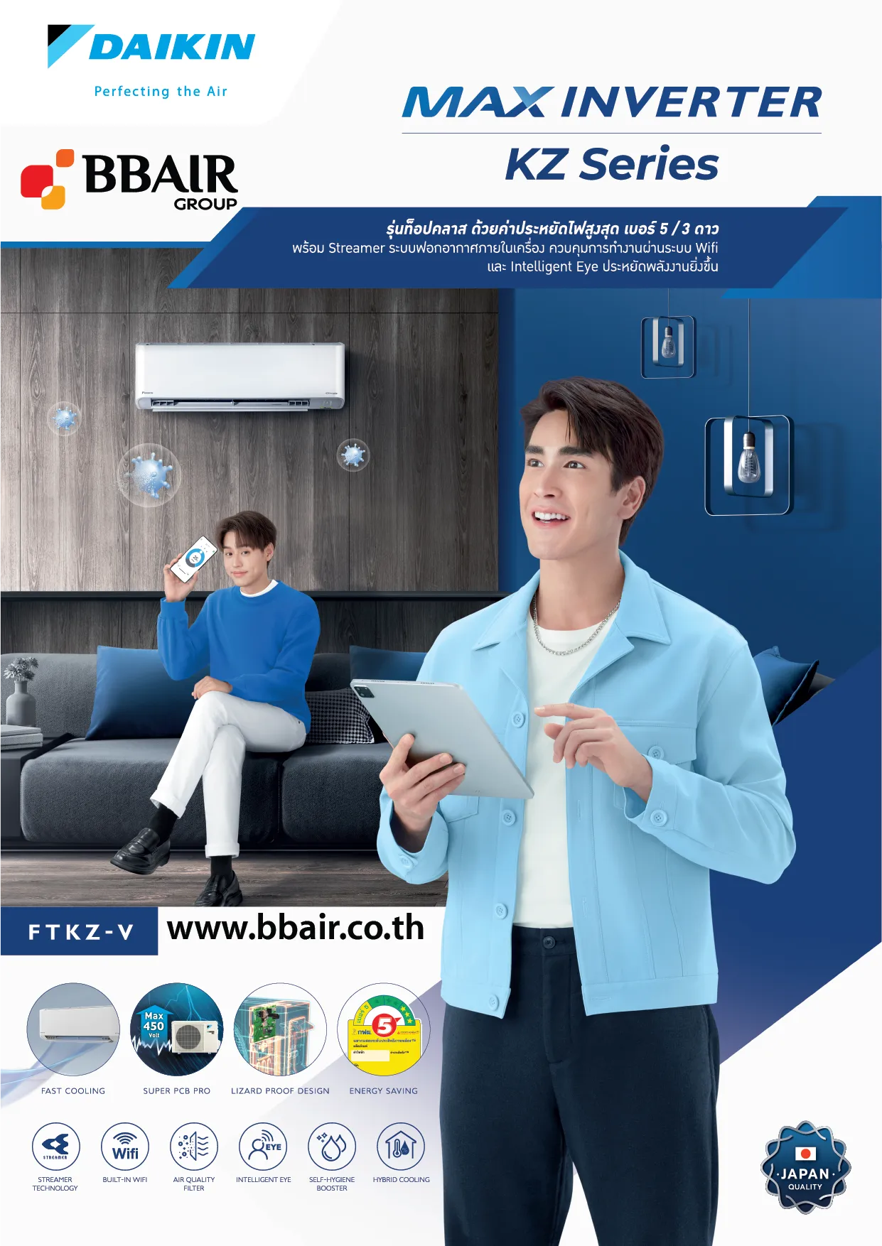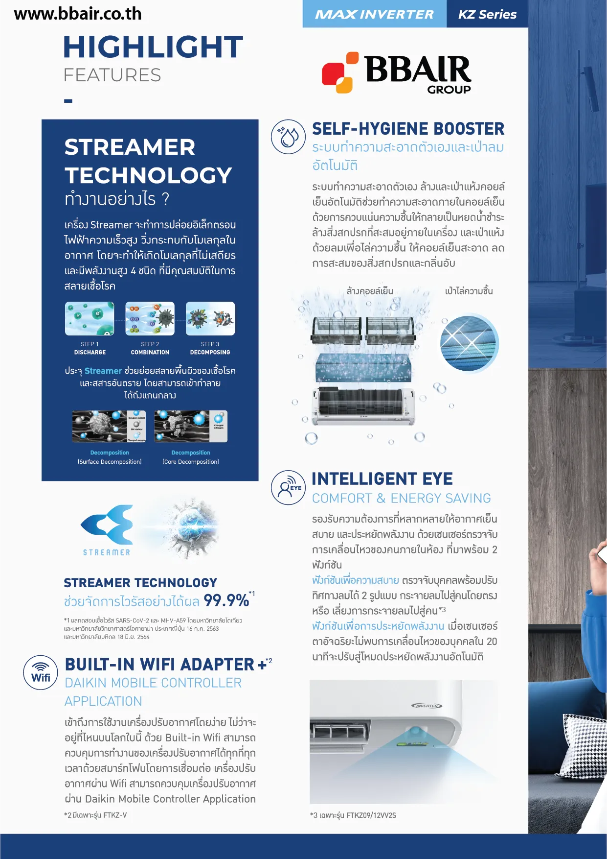 เครื่องปรับอากาศที่มาพร้อมฟังก์ชั่นฟอกอากาศ ด้วย Streamer Technology ประจุอิเล็กตรอนความเร็วสูงที่สามารถช่วยยับยั้งเชื้อโรค สสารอันตรา ภายในอากาศที่ผ่านเข้ามาในเครื่องปรับอากาศ นอกจากนี้ ยังมาพร้อมกับฟังก์ชั่นทำความสะอาดเครื่องอัตโนมัติ (Self-Hygiene booster) ที่ช่วยล้างและเป่าแห้งพร้อมยับยั้งเชื้อโรค ลดการเกิดกลิ่นที่ไม่พึงประสงค์ ประหยัดค่าไฟ ด้วยค่าประหยัดพลังงานเบอร์ 5 ระดับ 3 ดาว เครื่องปรับอากาศ Streamer FTKZ ส่งอากาศที่ทั้งเย็นและสะอาดออกสู่ห้อง เพื่อลมหายใจที่สะอาดของคุณ