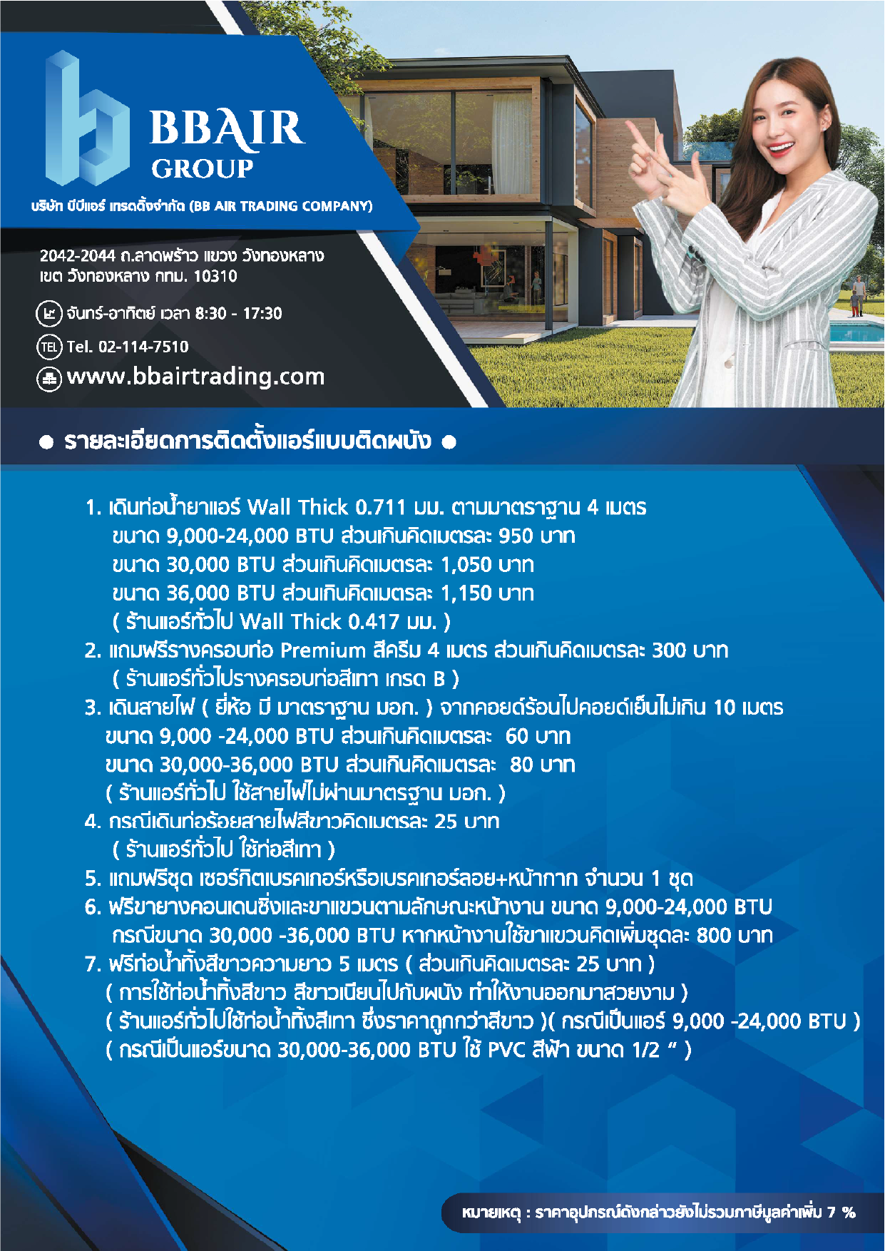 ขนาด 9,000 -24,000 BTU ส่วนเกินคิดเมตรละ 60 บาท