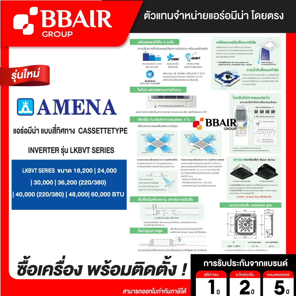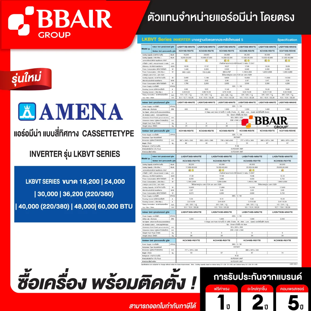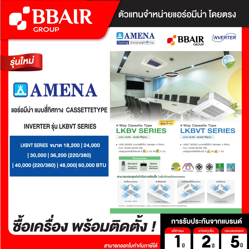คุณสมบัติสินค้าของแอร์อมีน่า แบบสี่ทิศทาง อินเวอร์เตอร์ LKBV SERIES น้ำยาแอร์ R-32