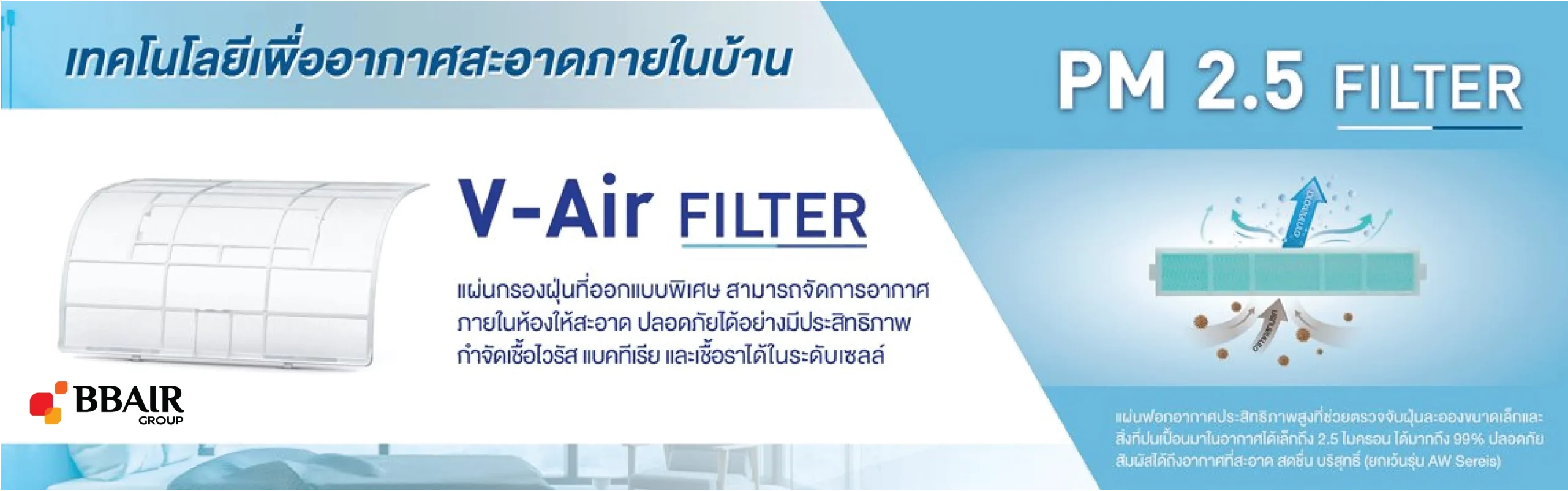 ปลอดภัยสัมผัสได้ถึงอากาศที่สะอาด สดชื่น บริสุทธิ์ (ยกเว้นรุ่น AW Sereis)V-Air FILTER