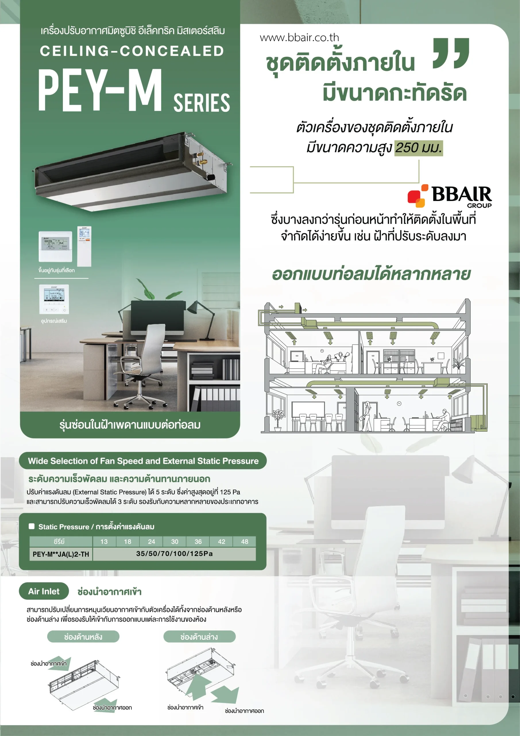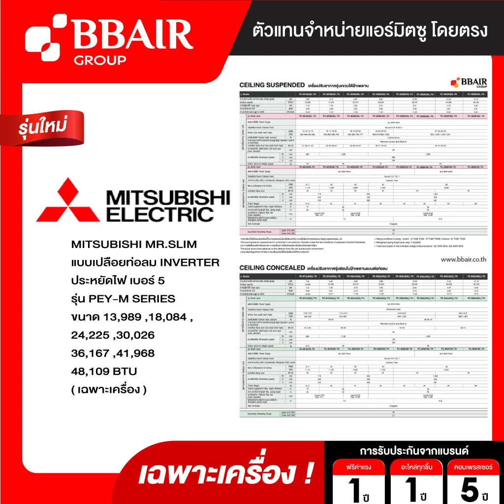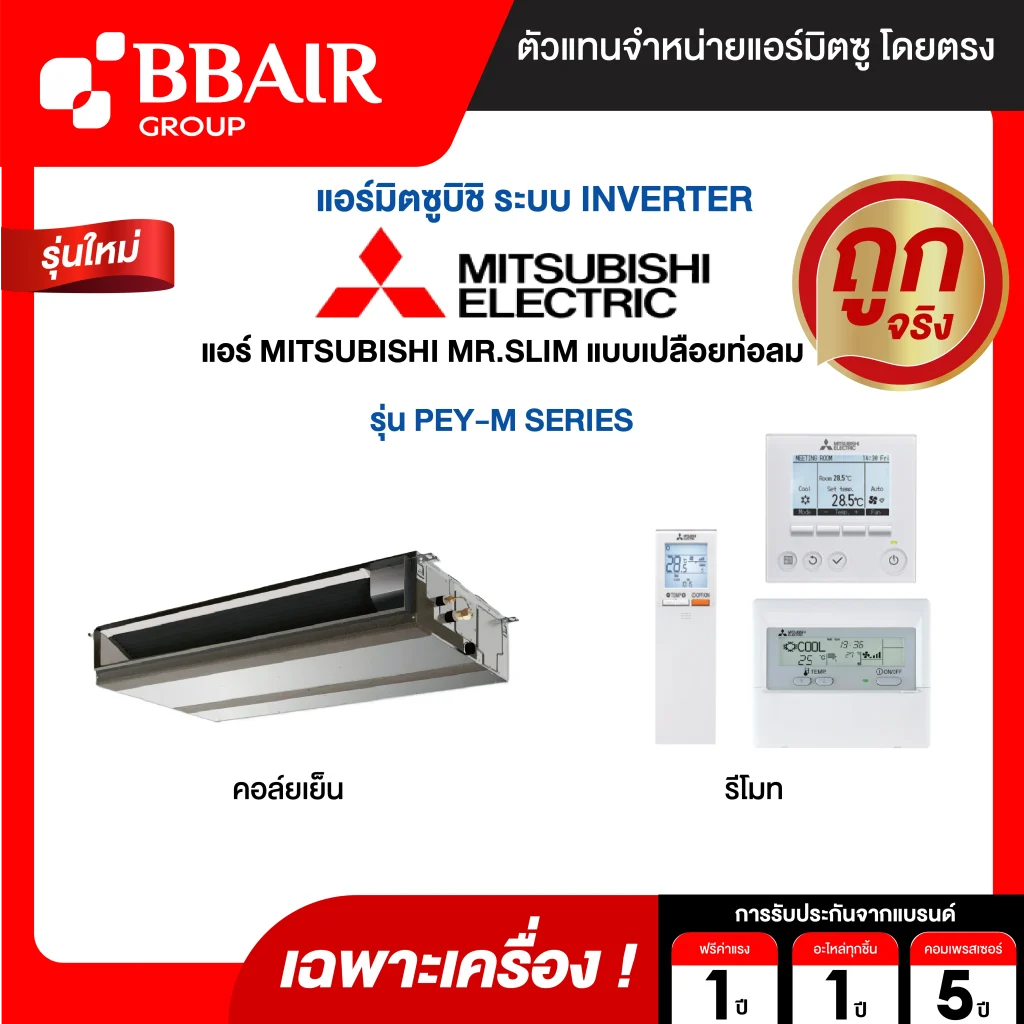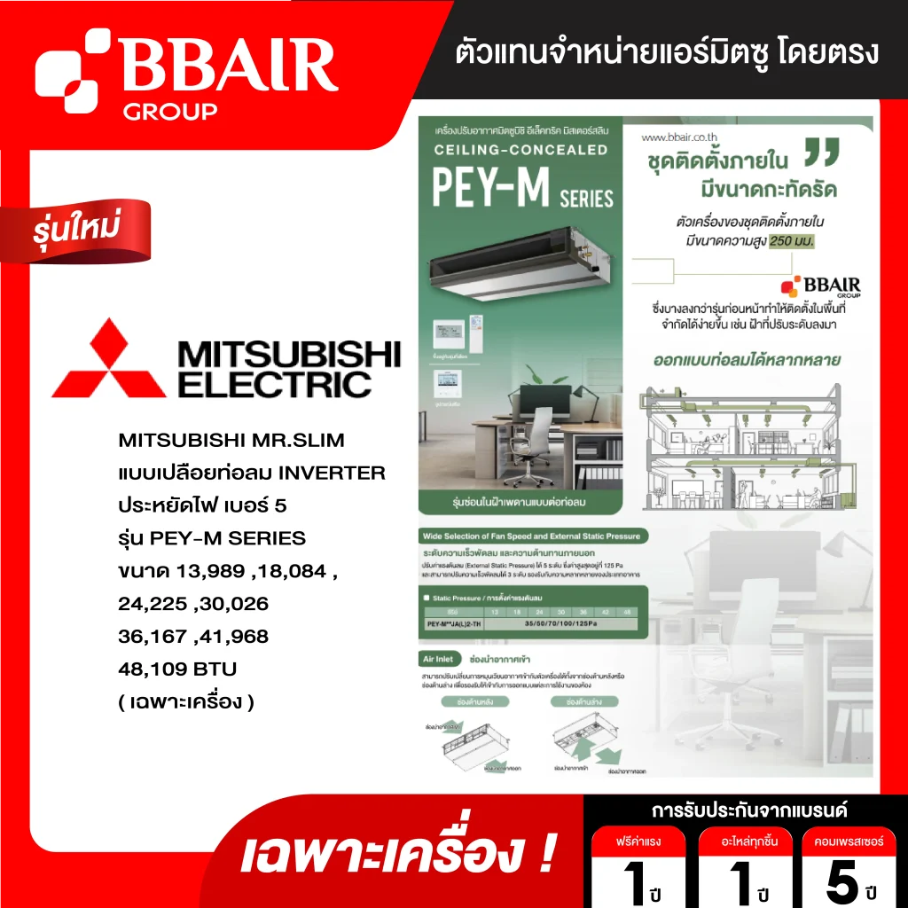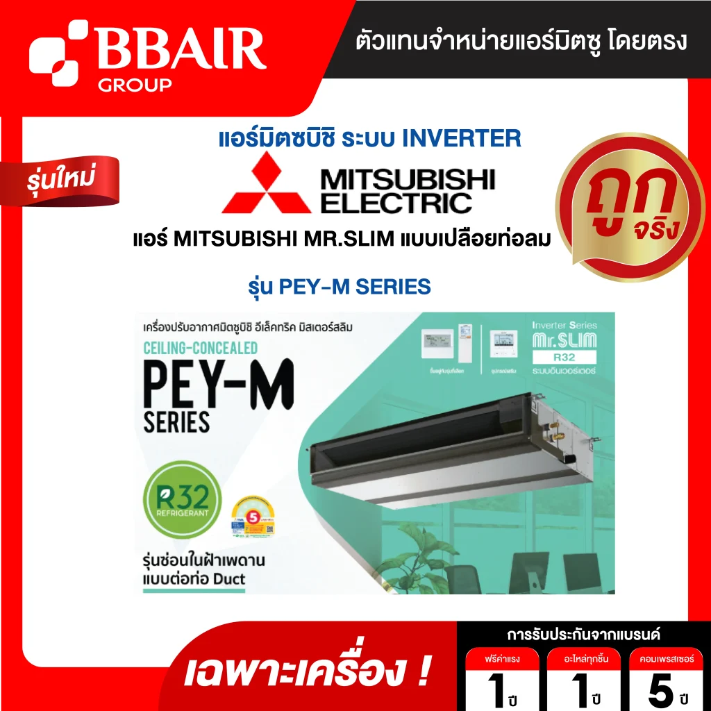 คุณสมบัติสินค้าของแอร์มิตซูบิชิ มิสเตอร์สลิม Mitsubishi Mr.Slim แบบเปลือยท่อลม อินเวอร์เตอร์ PEY-M SERIES น้ำยาแอร์ R-32