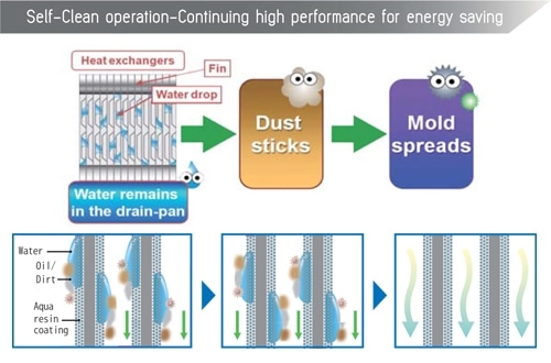 เพื่อประสิทธิภาพที่สูงสุดและประหยัดพลังไฟฟ้า โดยเคลือบสาร Aqua Resin ทำให้สามารถป้องกันการเกาะของฝุ่น หรือสิ่งสกปรกที่ครีบระบายความร้อนและช่วยยับยั้ง การก่อตัวของเชื้อแบคทีเรีย