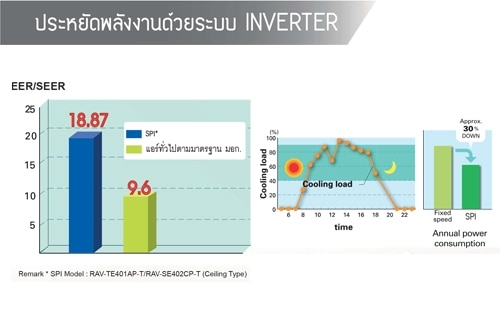 มีเทคโนโลยีอัญชาญฉลาดที่ให้ประสิทธิภาพ การทำความเย็นสูงแต่ใช้กระแสไฟต่ำ ด้วยระบบการทำงานแบบ Inverter และยิ่งประหยัดพลังงานเพิ่มขึ้น ขณะทำงานที่ Part load ในภาวะการทำความเย็นน้อย