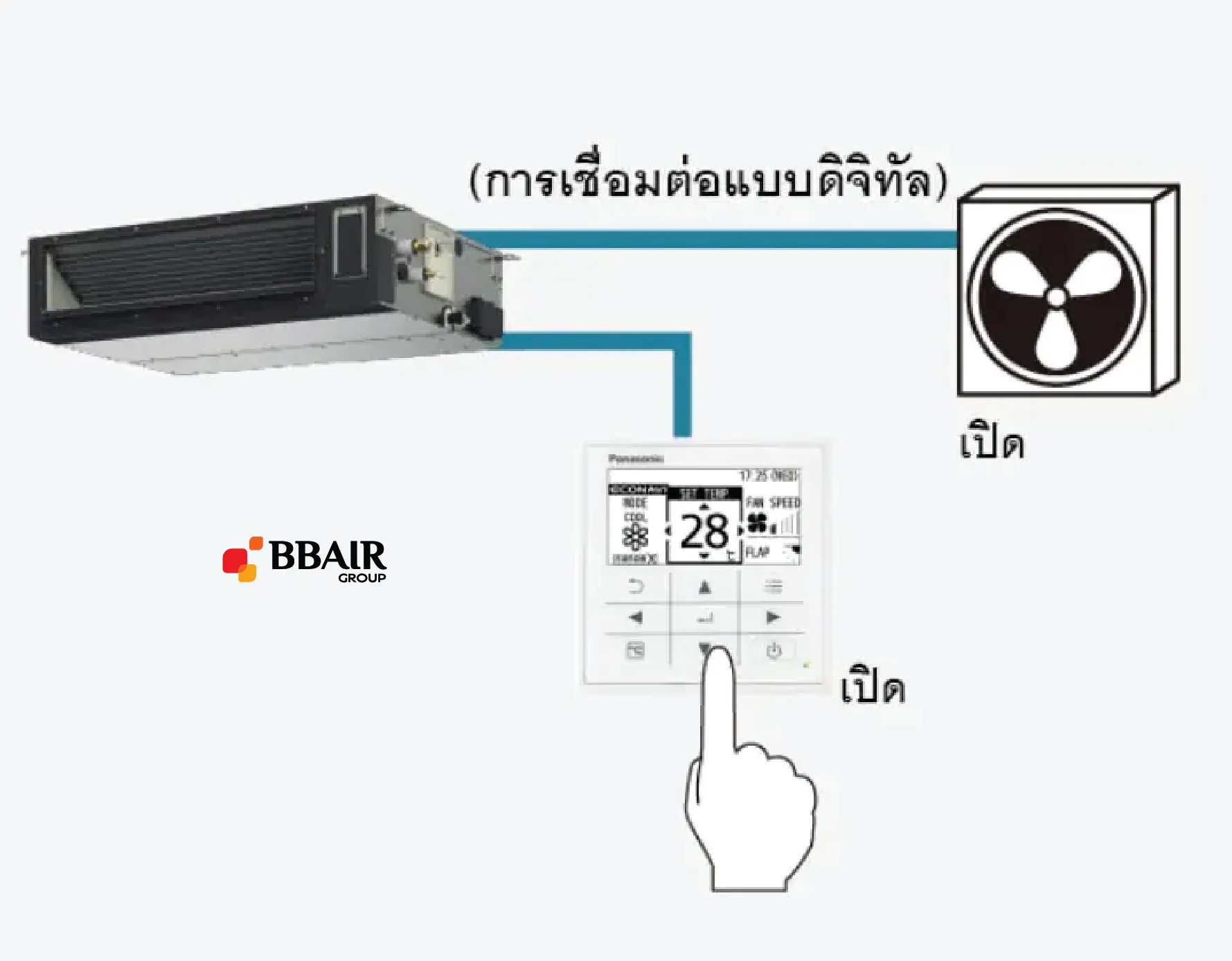 เมื่อมีการเชื่อมต่ออุปกรณ์ภายนอก เช่น พัดลมระบายอากาศ เข้ากับชุดอุปกรณ์ภายในอาคารแล้ว สามารถควบคุมการเปิด/ปิดของพัดลมระบายอากาศได้ด้วยรีโมตคอนโทรลแบบมีสาย คุณสามารถเลือกได้ว่าจะทำงานเชื่อมต่อกับพัดลมระบายอากาศหรือแยกอิสระจากกัน