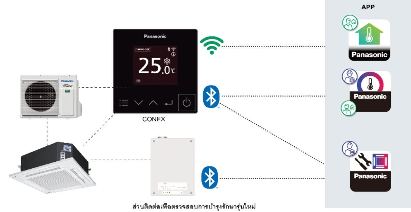 เพียงใช้อะแดปเตอร์เครือข่ายในตัวและแอป Comfort Cloud ของ Panasonic ก็สามารถเชื่อมต่อกับเครื่องปรับอากาศได้สูงสุด 20 เครื่องในสถานที่แห่งเดียว (สูงสุด 10 แห่ง) เข้าถึงคุณสมบัติทั้งหมดของเครื่องปรับอากาศได้จากระยะไกล ติดตามและตรวจสอบการใช้งานเครื่องปรับอากาศโดยใช้สถิติพลังงานที่ครอบคลุม และระบุปัญหาพร้อมการแจ้งเตือนข้อผิดพลาดเพื่อการแก้ไขอย่างง่ายดาย ซึ่งทั้งหมดนี้ทำได้จากอุปกรณ์เคลื่อนที่เครื่องเดียว