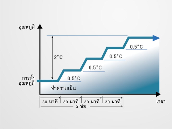 ประหยัดพลังงานสูงสุด 20%* เครื่องปรับอากาศจะกำหนดสภาวะการทำงานที่คงที่แล้วค่อยๆ ปรับอุณหภูมิขึ้นทีละ 0.5 องศาเซลเซียสเพื่อควบคุมการประหยัดพลังงาน (สูงสุด 2 องศาเซลเซียส)