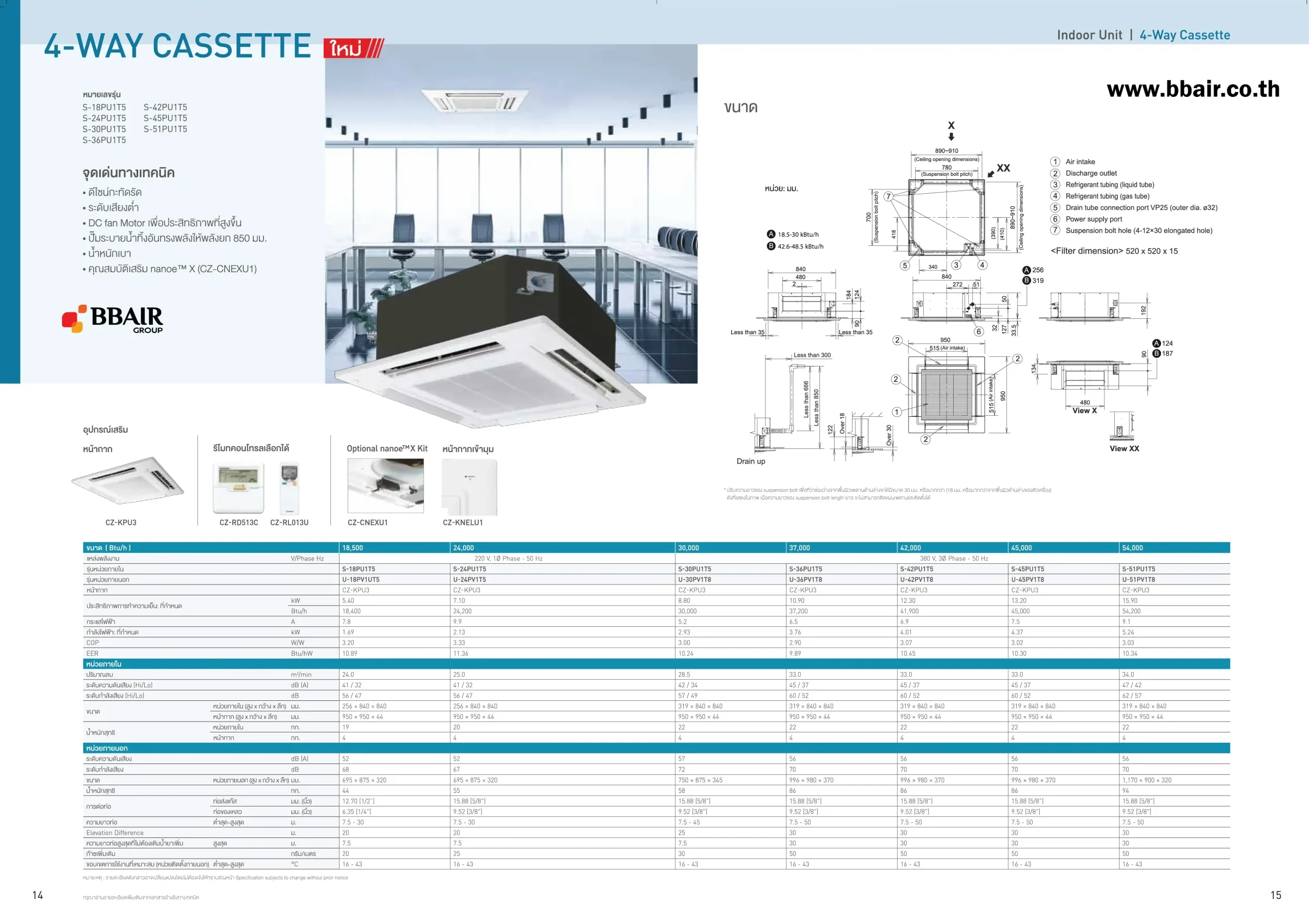 - ประเภท: แอร์แบบฝังฝ้า 4 ทิศทาง (4-way cassette).