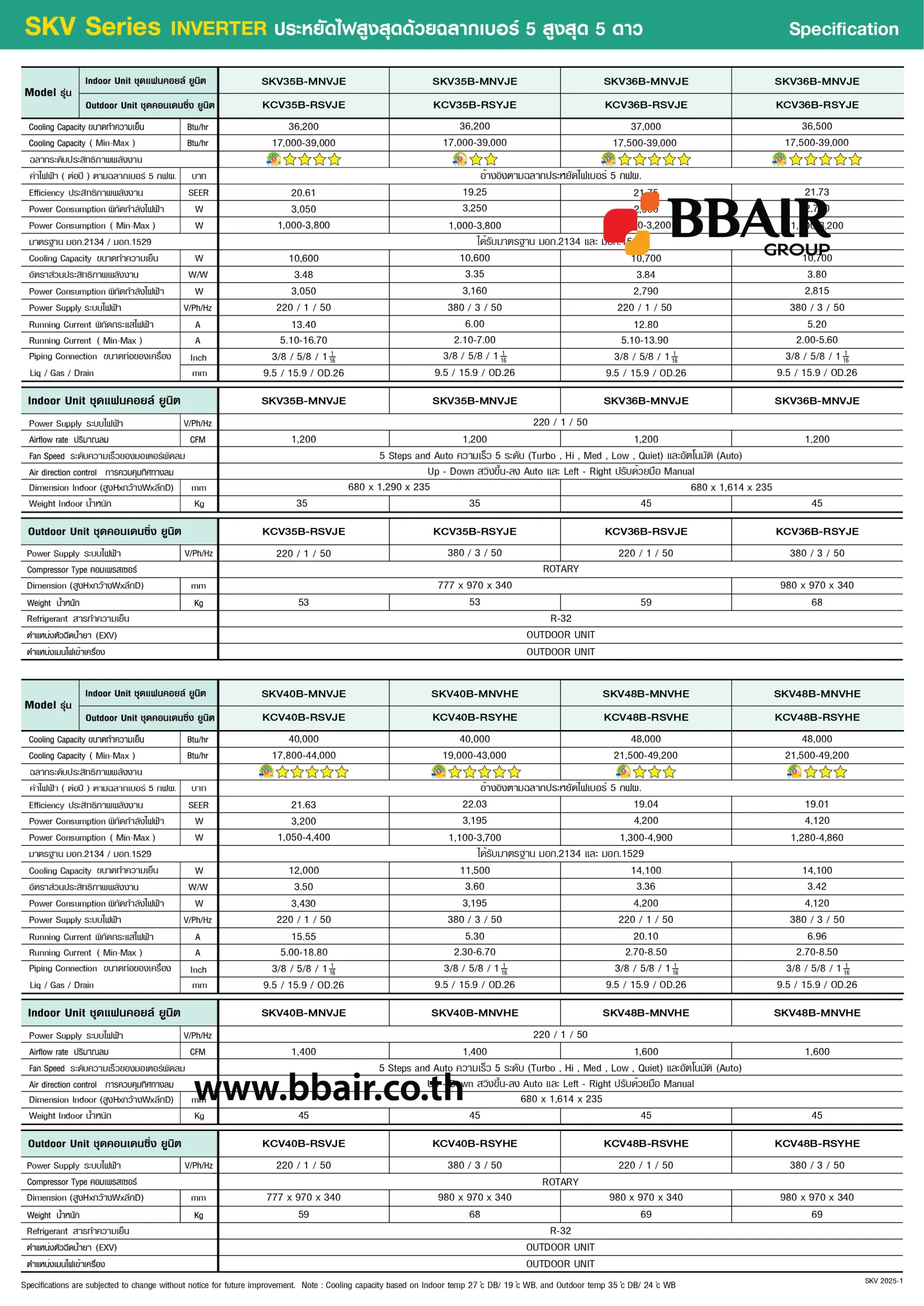 • SKV36B-MNVJE/KCV36B-RSYJE (R-32) ขนาด 36,500(17,500-39,000) BTU (380 V) รีโมทไร้สาย