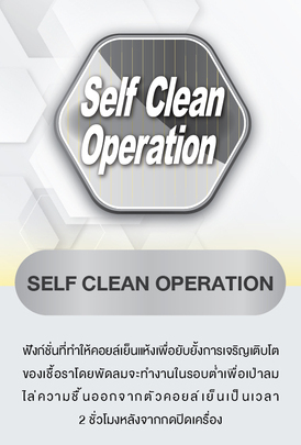 ฟิงก์ชั่นที่ทำให้คอยล์เย็นแห้งเพื่อยับยั้งการเจริญเติบโตของเชื้อราโดยพัดลมจะทำงานในรอบต่ำเพื่อเป๋าลมไล่ความชื้ นออกจากตัวคอยล์เย็นเป็นเวลา2 ชั่วโมงหลังจากกดปิดเครื่อง