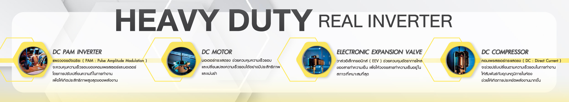 หมดห่วงถ้าเป็นเรื่อง Inverter เพราะ Mitsubishi Heavy Duty พัฒนาระบบ Real Inverter ขึ้นมา เพื่อการทำงานอย่างเต็มเม็ดเต็มหน่วย ใช้พลังงานอย่างคุ้มค่าและในขณะเดียวกันก็ทำให้เกิดการประหยัดพลังงานสูงสุด โดยขุมพลังของเครื่องปรับอากาศประเภท Inverter แบบ Mitsubishi Heavy Duty นั้น ประกอบด้วยชิ้นส่วนสำคัญสี่ชิ้นส่วน