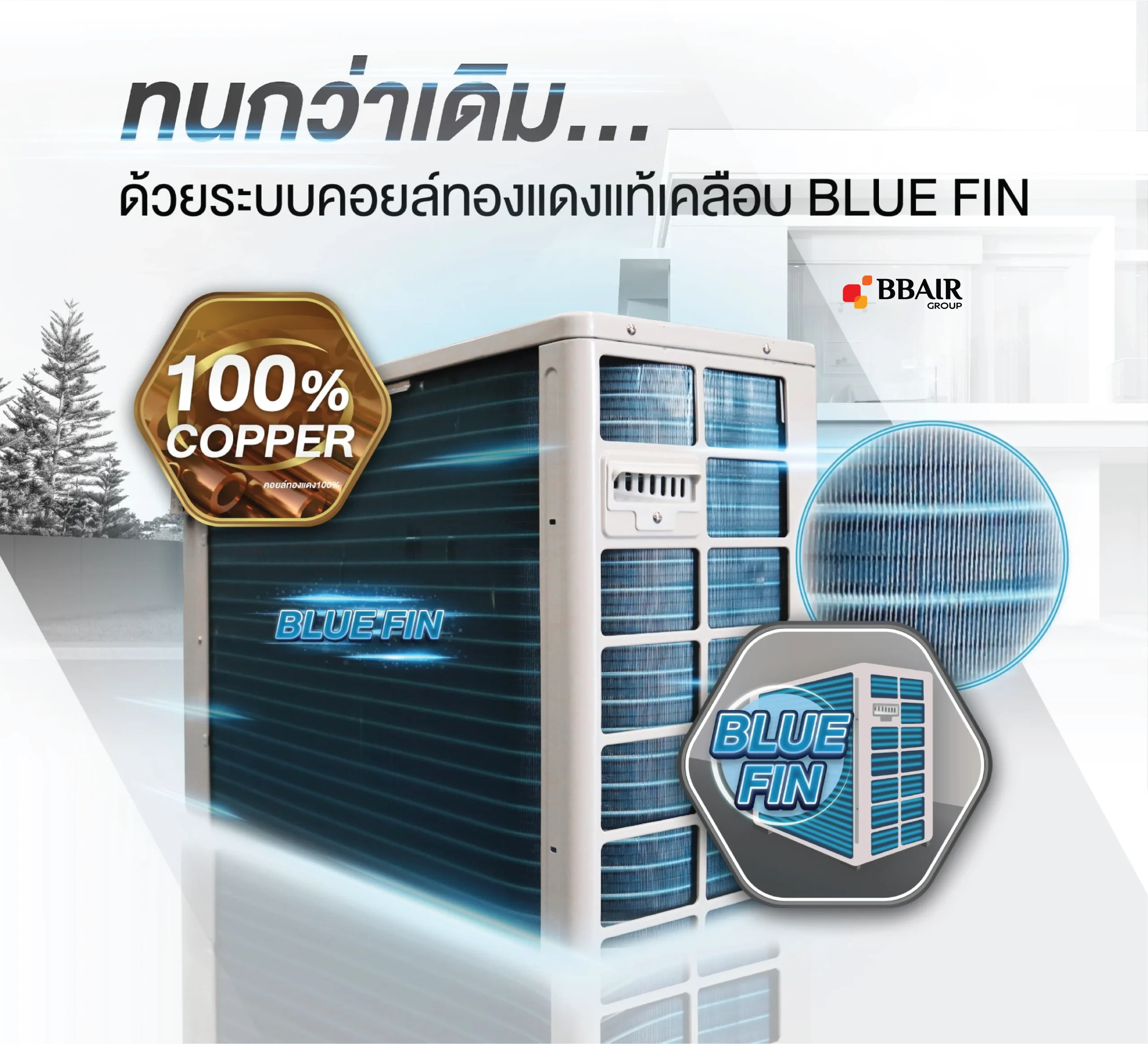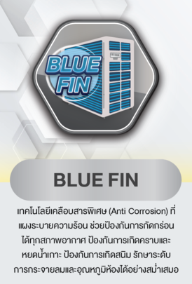 - BLUE FIN เทคโนโลยีเคลือบสารพิเศษ (Anti Corrosion) ที่แผงระบายความร้อน ช่วยป้องกันการกัดกร่อนได้ทุกสภาพอากาศ ป้องกันการเกิดคราบและหยดน้ำเกาะ ป้องกันการเกิดสนิม รักษาระดับการกระจายลมและอุณหภูมิห้องได้อย่างสม่ำเสมอ