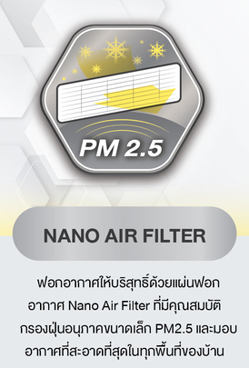 - NANO AIR FILTER ฟอกอากาศให้บริสุทธิ์ด้วยแผ่นฟอกอากาศ Nano Air Filter ที่มีคุณสมบัติกรองฝุ่นอนุภาคขนาดเล็ก PM 2.5 และมอบอากาศที่สะอาดที่สุดในทุกพื้นที่ของบ้าน