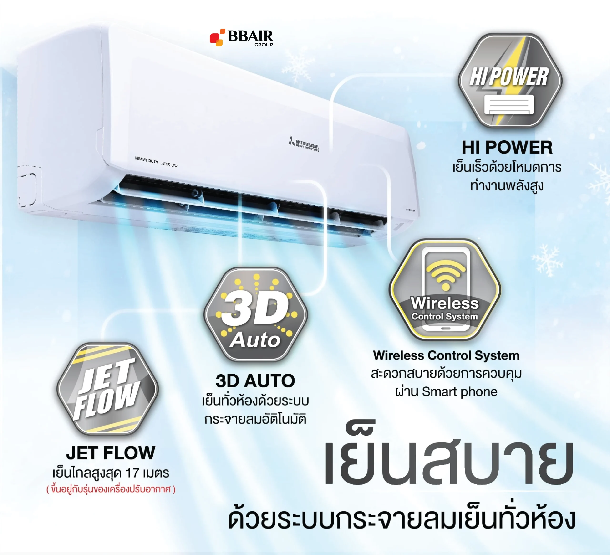 - JET FLOW เทคโนโลยีการกระจายอากาศ เย็นเร็วด้วยระบบกระจายลมที่ใช้เทคโนโลยีเดียวกับใบพัดในเครื่องยนต์เจ็ททำให้สามารถส่งลมได้ไกล 15-17 เมตร