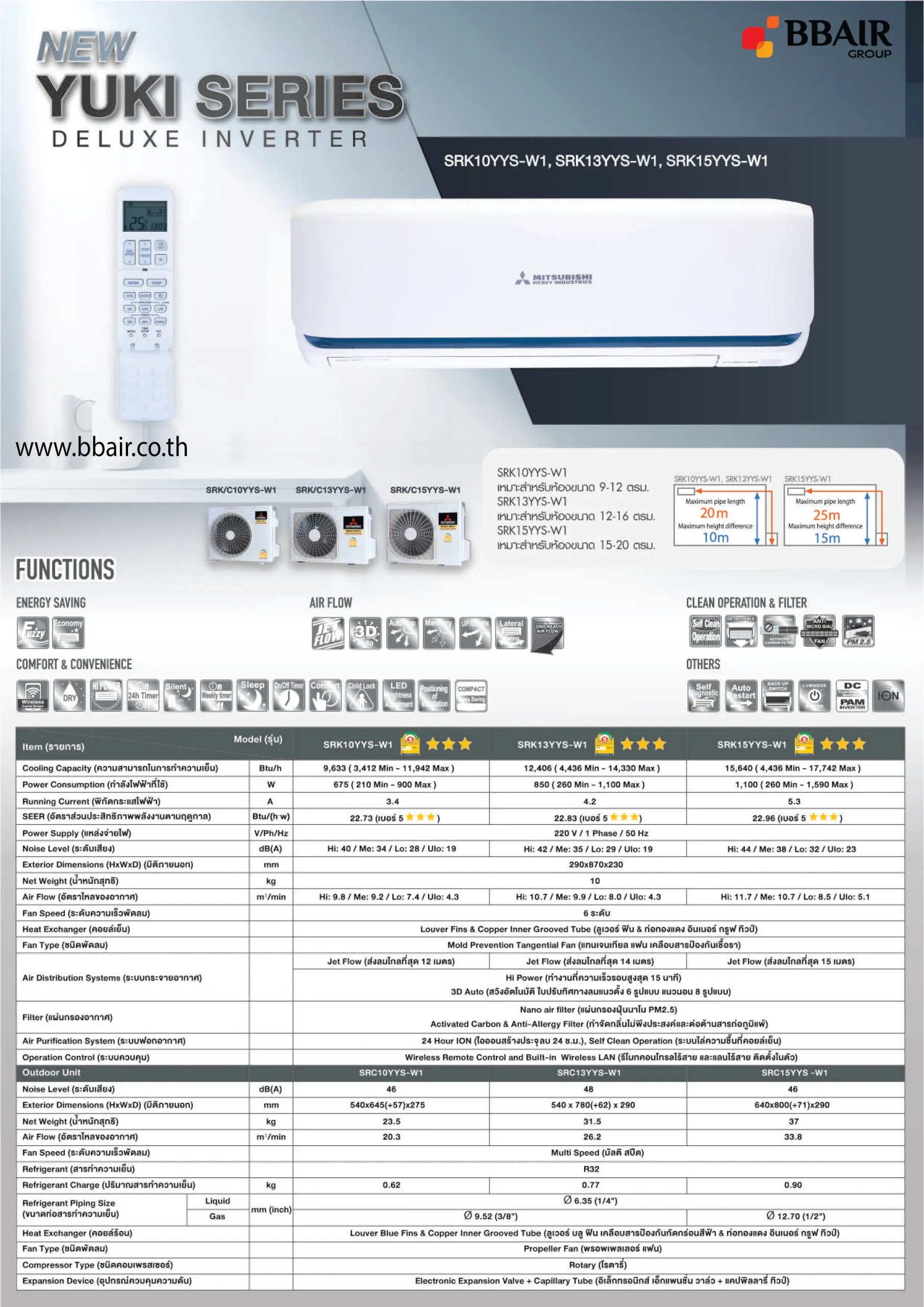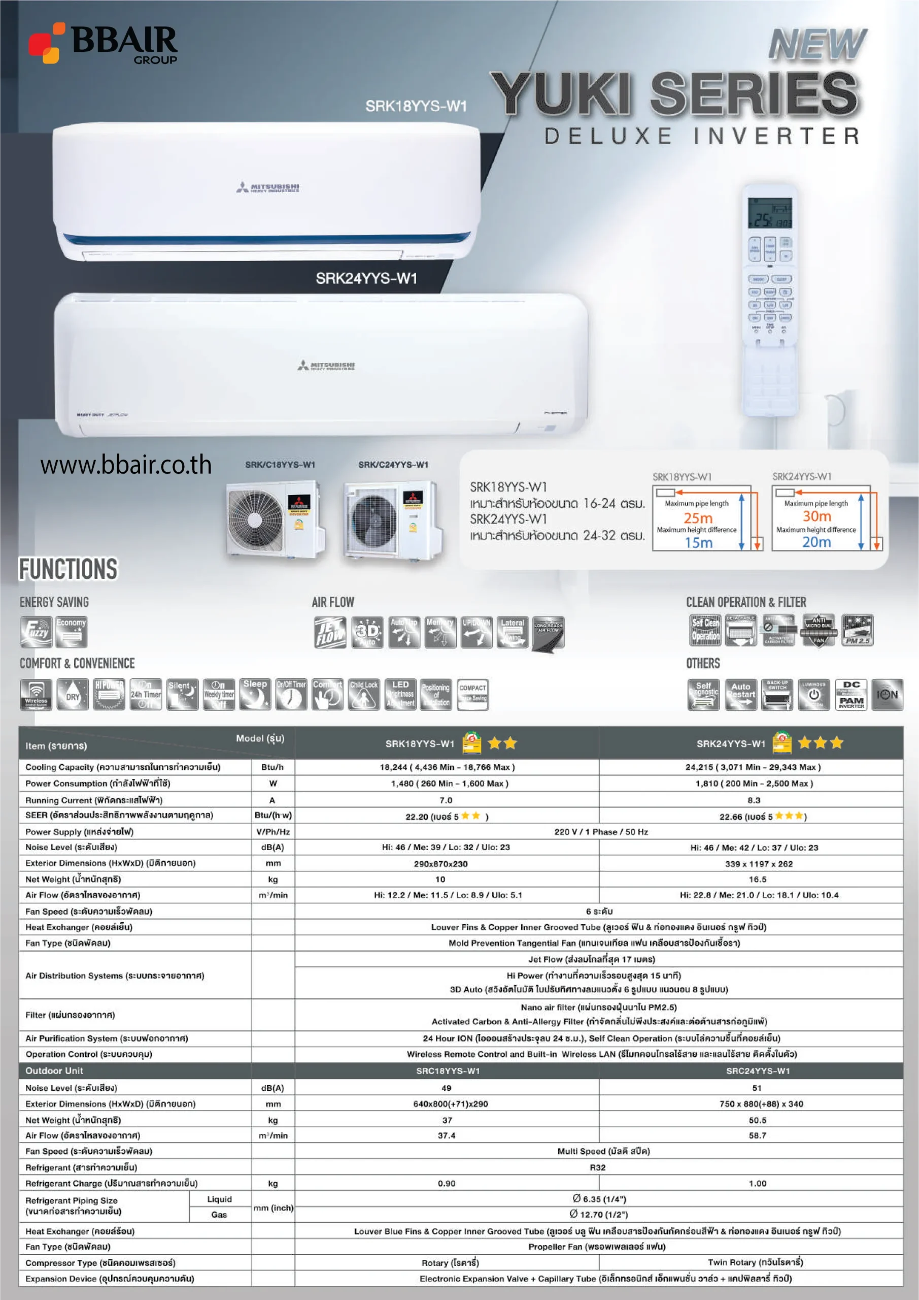 คุณสมบัติสินค้าของแอร์มิตซูบิชิ เฮฟวี้ดิวตี้ แบบติดผนังอินเวอร์เตอร์ INVERTER SRK-YYS SERIES น้ำยาแอร์ R-32