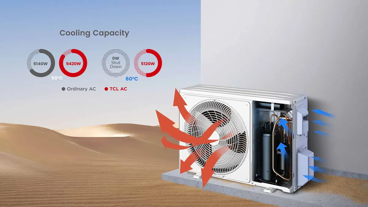 การรักษาความเย็นที่เสถียร แม้อุณหภูมิภายนอกร้อนถึง 60°C ทําให้คุณเย็นสบายไม่ว่าอุณหภูมิภายนอกจะสูง กล่องควบคุม E-box ยังระบายความร้อนด้วยอากาศไหลเวียนช่วยให้มั่นใจได้ถึงการระบายความร้อนอย่างต่อเนื่อง แม้ที่อุณหภูมิแวดล้อมภายนอก 60°C และความสามารถในการทําความเย็น 100% ที่อุณหภูมิแวดล้อม 50°C