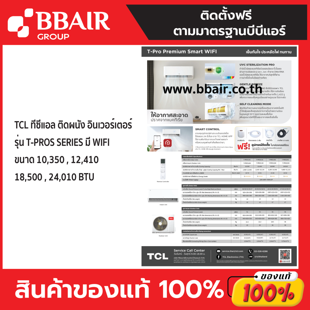 แอร์ทีซีแอล TCL แบบติดผนัง อินเวอร์เตอร์ T-PROS มี WIFI รุ่น T-PROS-H BTU พร้อมติดตั้ง
