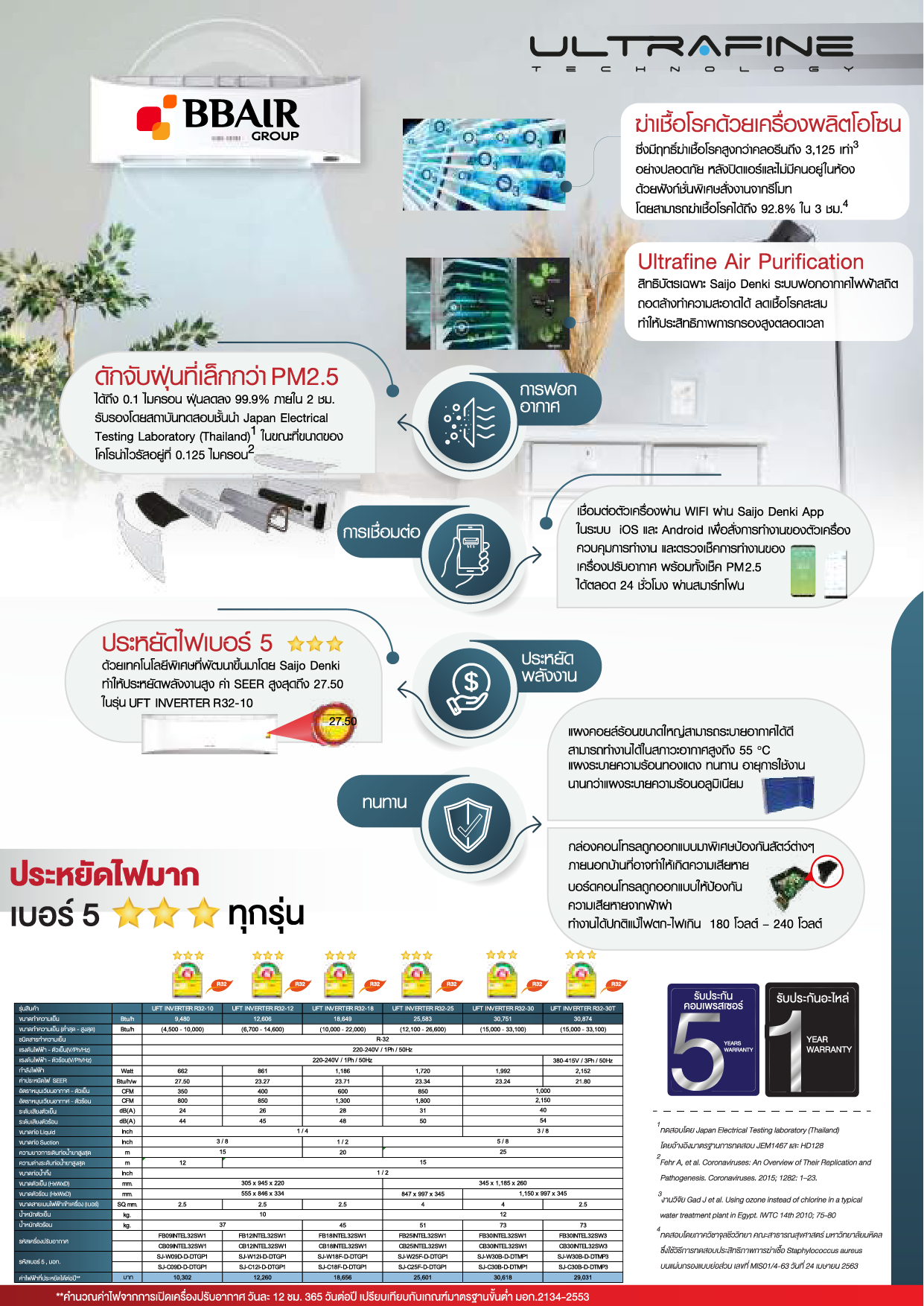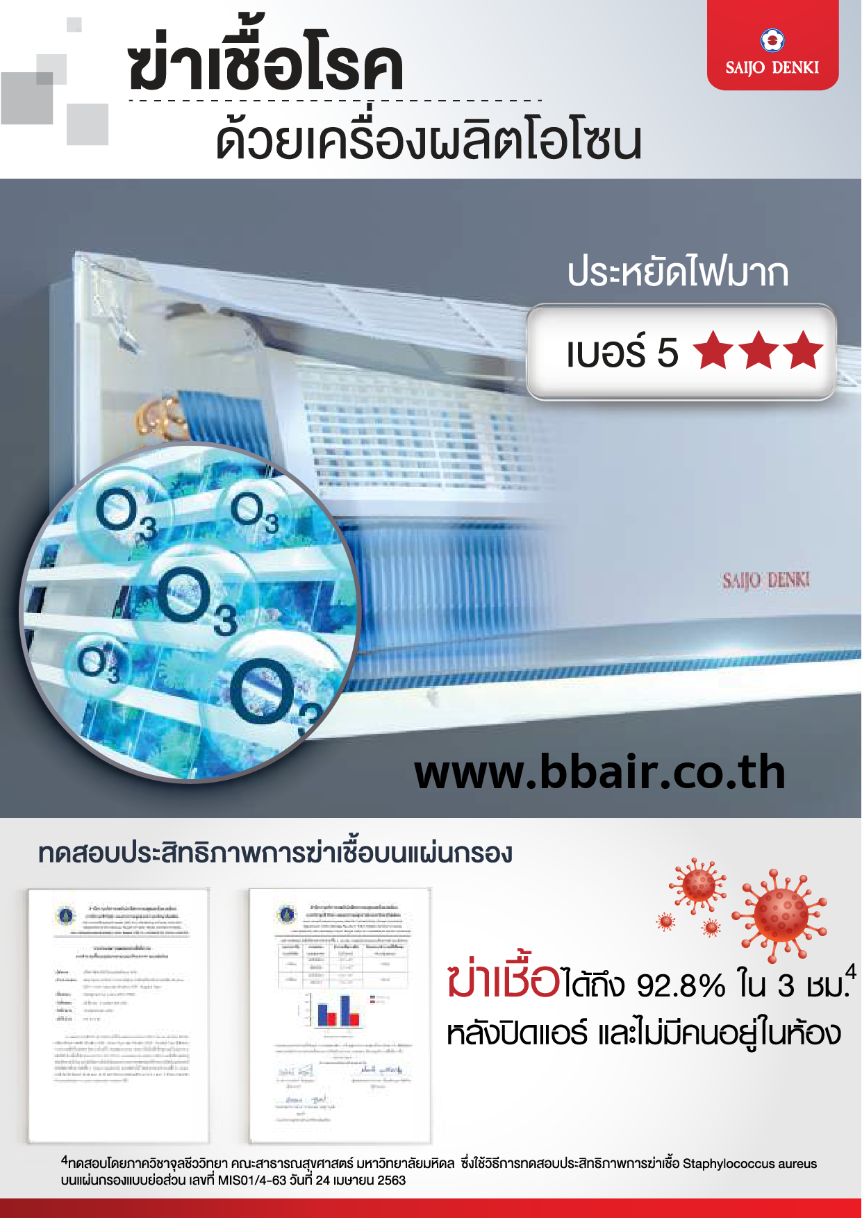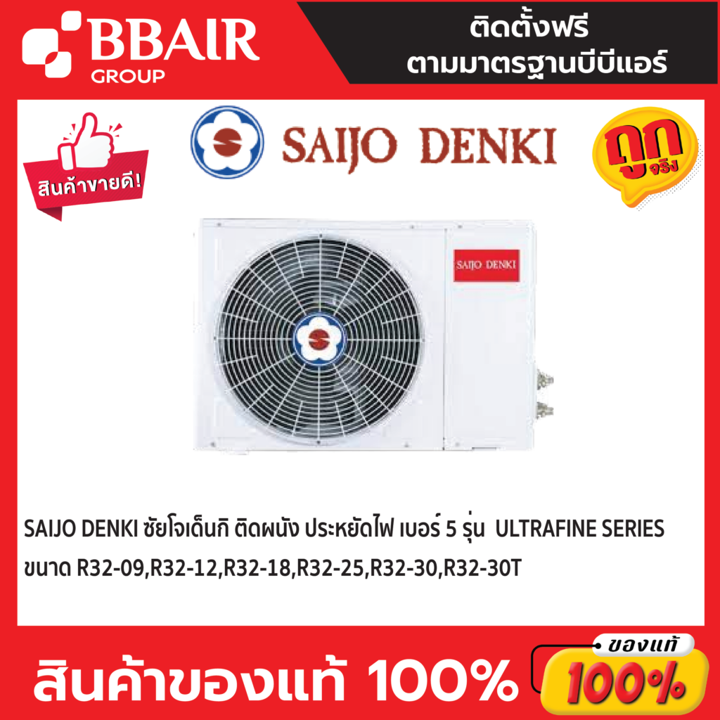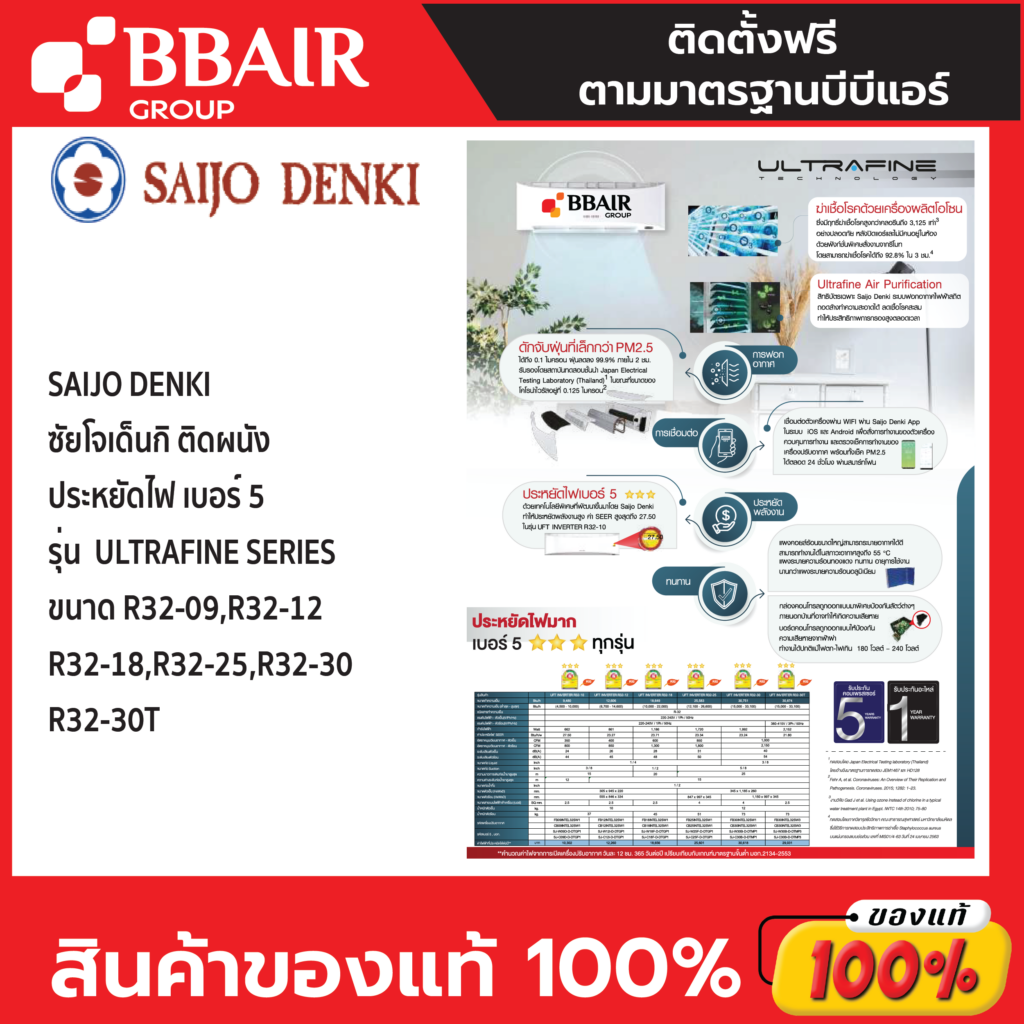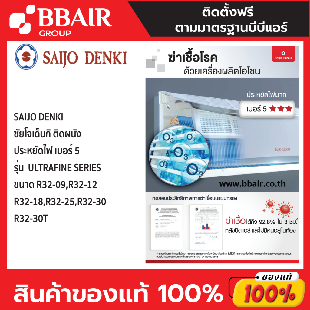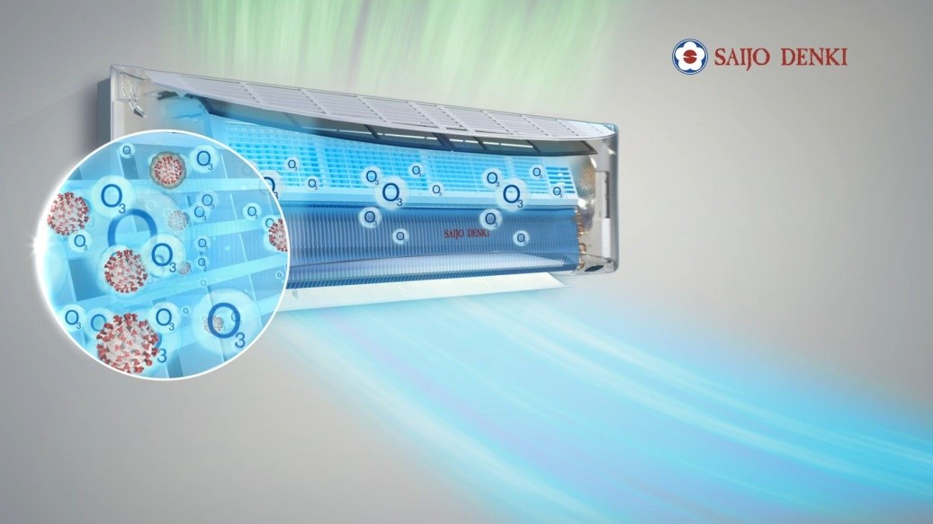 แอร์หนึ่งเดียวที่เป็นเครื่องฆ่าเชื้อด้วยโอโซน เพื่ออากาศสดชื่น ปลอดภัยของคุณและคนที่คุณรักมั่นใจอากาศสะอาดในบ้านคุณ ด้วย 3 ขั้นตอน Ultrafine Inverter แอร์หนึ่งเดียวที่มีคุณสมบัติเป็น “เครื่องฆ่าเชื้อด้วยโอโซน” สิทธิบัตรเฉพาะของ Saijo Denki 1ซึ่งไม่ใช้แผ่นฟิลเตอร์กรองเชื้อโรคเหมือนแอร์ทั่วไป แต่ใช้เครื่องผลิตโอโซนขนาดใหญ่เพื่อฆ่าเชื้อโรคที่ดักจับไว้อยู่ในเครื่องปรับอากาศเนื่องจากประเทศไทยเป็นเมืองร้อนชื้น การดักจับเชื้อโรคอยู่ในแผ่นฟิลเตอร์เพียงอย่างเดียว ซึ่งส่วนใหญ่ฟิลเตอร์มักทำจากกระดาษจึงอาจทำให้เชื้อโรคเจริญเติบโตต่อบนแผ่นฟิลเตอร์ได้ โดยมีงานวิจัยหลายแห่ง พบเชื้อโรคจำนวนมากยังมีชีวิตอยู่บนแผ่นกรองอากาศ 2Saijo Denki จึงคิดค้นนวัตกรรมเครื่องฆ่าเชื้อด้วยโอโซน 3 ขั้นตอน เพื่อให้บ้านคุณสะอาด ปลอดภัยอย่างแท้จริง