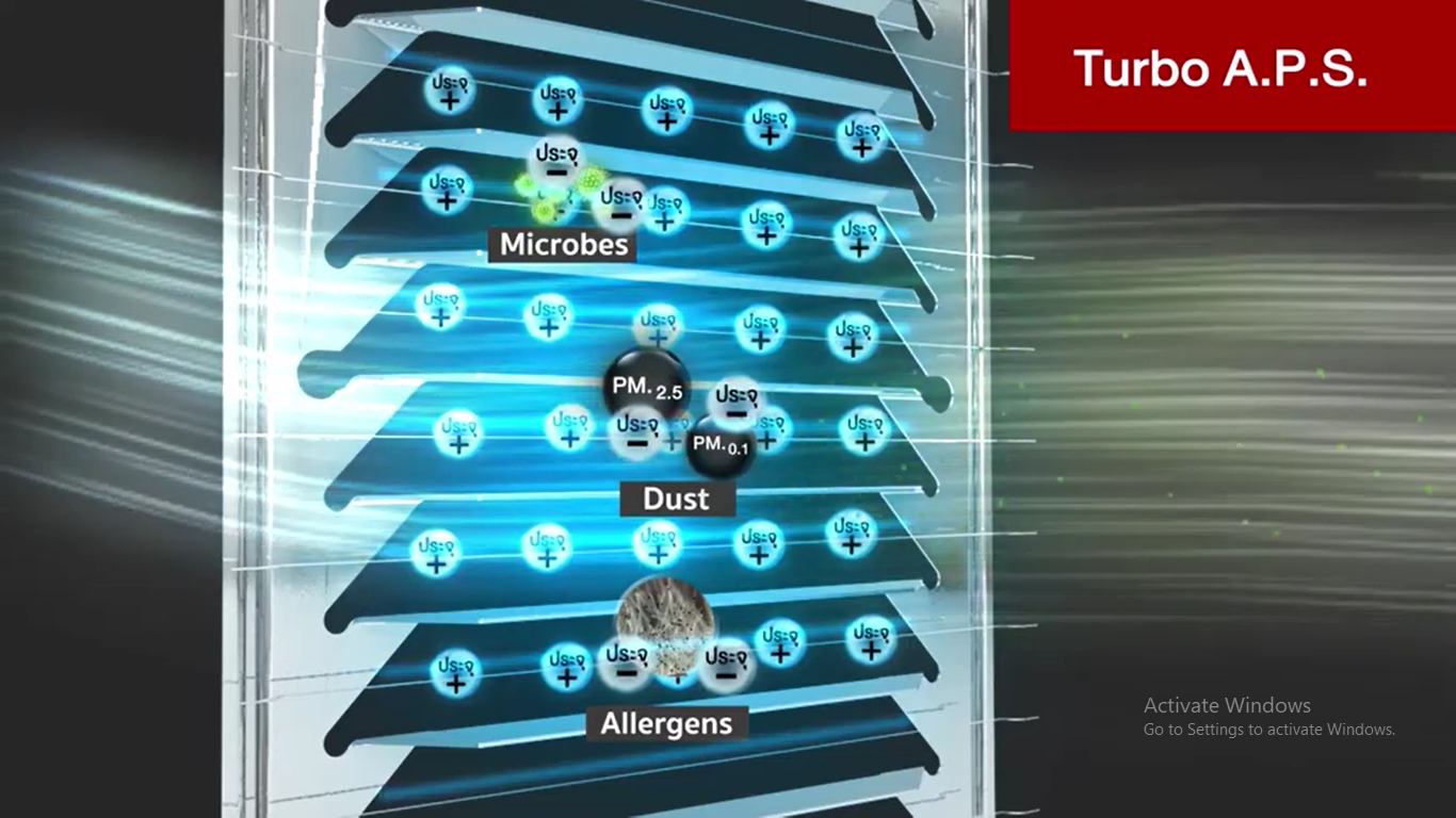 ขั้นตอนที่ 1: โหมด Turbo ดักจับฝุ่นและเชื้อโรค ที่ลอยอยู่ในอากาศมาเก็บไว้ที่ระบบฟอกอากาศ Ultrafine ด้วยรอบพัดลมแรงสูงเป็นเวลา 2 ชม. เพื่อรอการฆ่าเชื้อด้วยโอโซนในโหมดถัดไป โดยระบบนี้ใช้หลักการไฟฟ้าสถิตกำลังแรงสูงถึง 5,000 โวลต์ เพื่อกรองฝุ่น และดักจับเชื้อโรคขนาดเล็กได้อย่างรวดเร็ว ซึ่งระบบฟอกอากาศดังกล่าวสามารถดักจับฝุ่นในอากาศได้ขนาดเล็กถึง 0.1 ไมครอนในขณะที่ไวรัสโคโรน่ามีขนาดประมาณ 0.125 ไมครอน3 โดยมีประสิทธิภาพดักจับฝุ่นได้สูงถึง 99% ใน 2 ชม. ตามมาตรฐานทดสอบประเทศญี่ปุ่น รับรองโดยสถาบันทดสอบระดับสากล Japan Electrical Laboratory (Thailand) และ มหาวิทยาลัยชั้นนำหลายแห่ง4เพื่อดึงฝุ่นหรือเชื้อโรคที่อยู่ในห้องมาเก็บไว้ในตัวเครื่องให้ได้มากที่สุด
