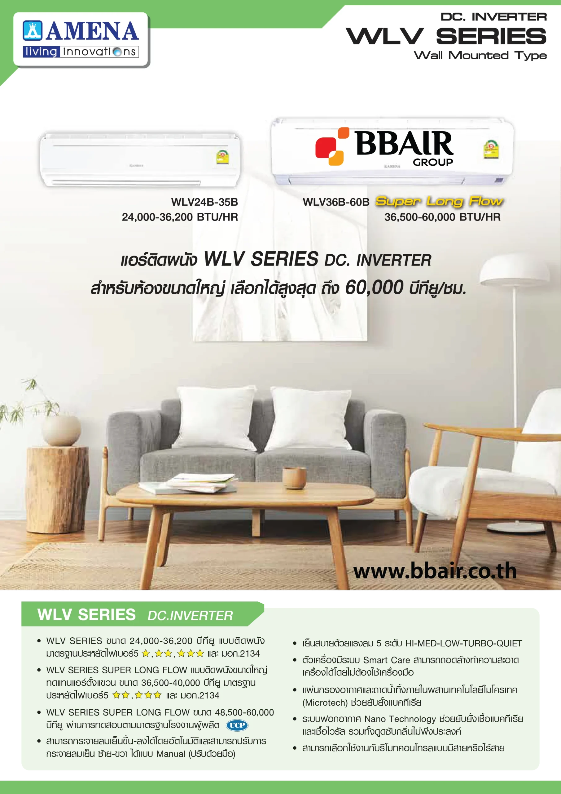 • WLV SERIES ขนาด 24,000-36,200 บีทียู แบบติดผนัง มาตรฐานประหยัดไฟเบอร์5 27,272, และ มอก.2134 ☆,
