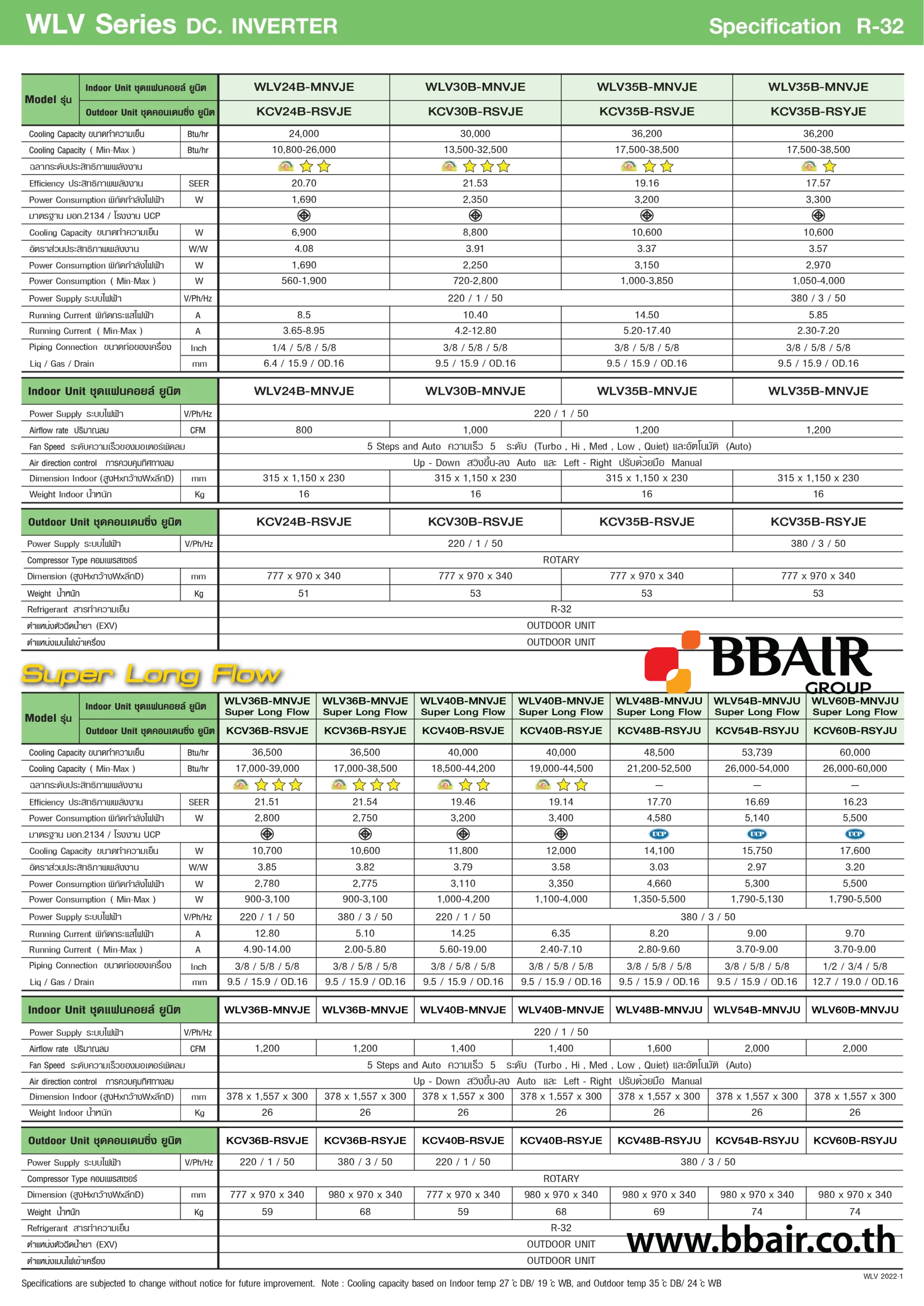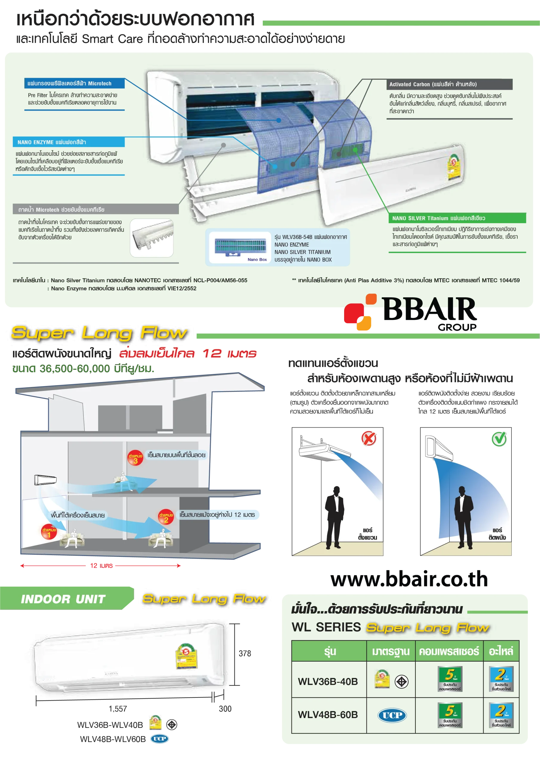 • WLV SERIES SUPER LONG FLOW แบบติดผนังขนาดใหญ่ ทดแทนแอร์ตั้งแขวน ขนาด 36,500-40,000 บีทียู มาตรฐาน ประหยัดไฟเบอร์5 Art, Art และ มอก.2134 น