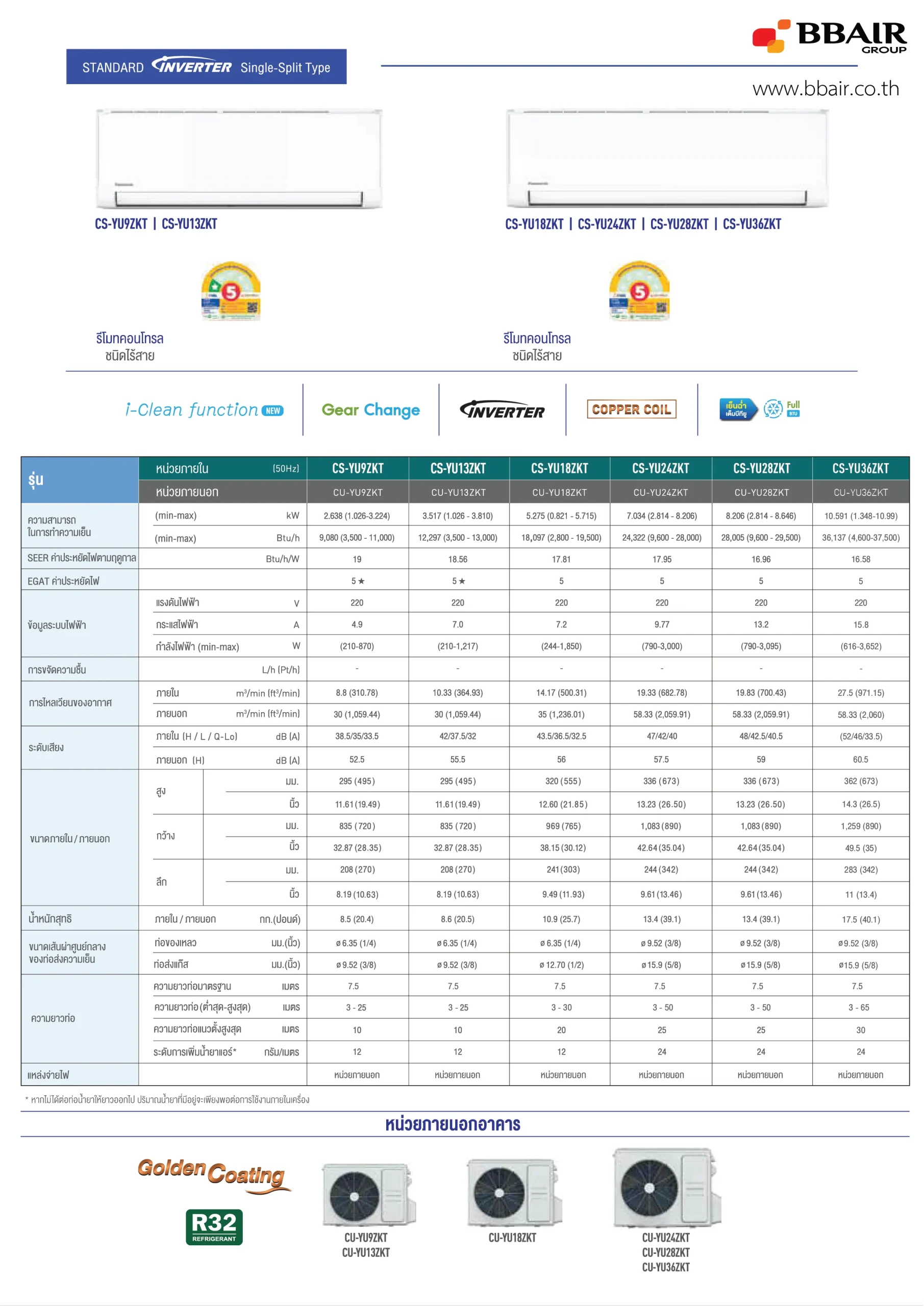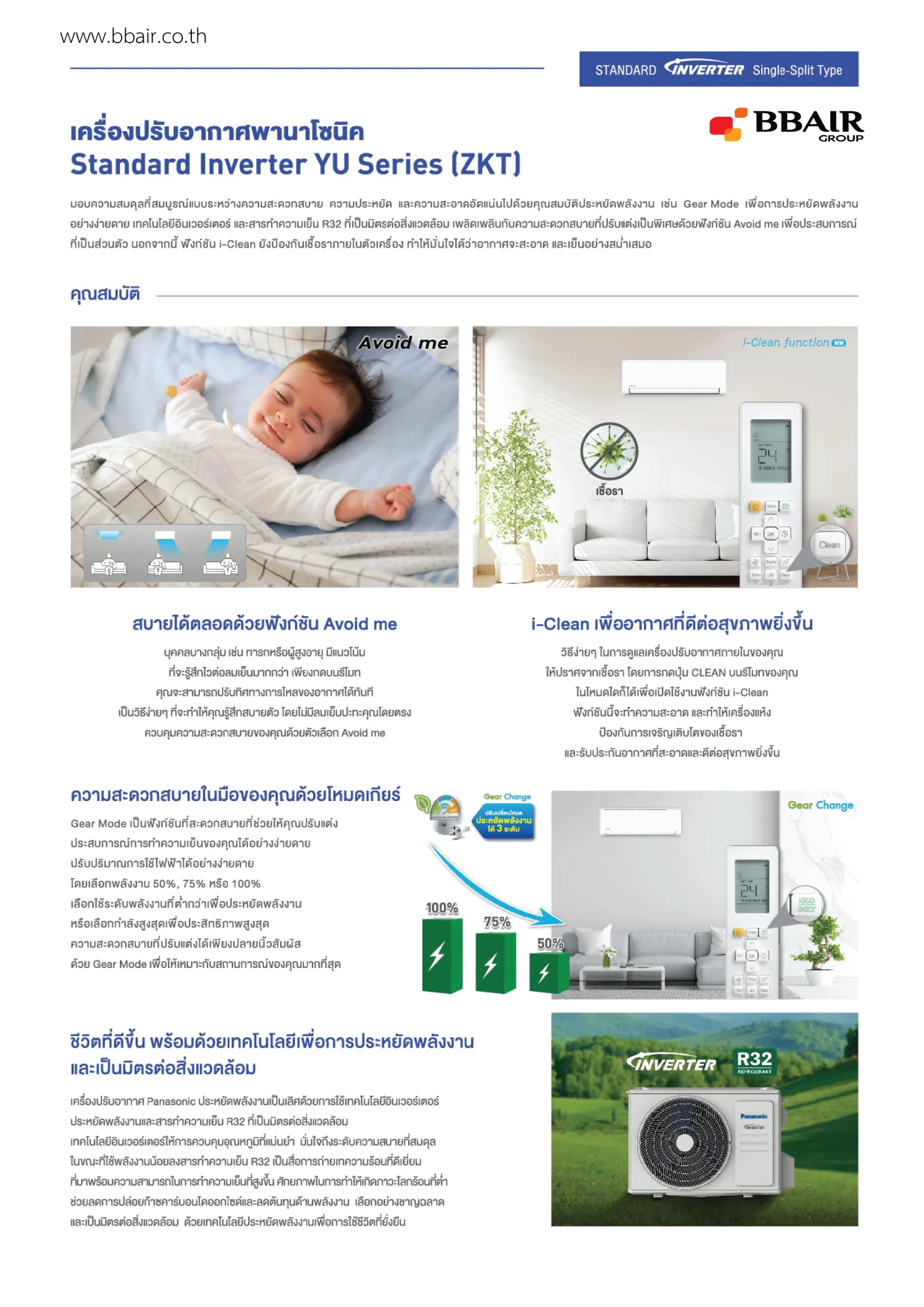 คุณสมบัติสินค้าของแอร์พานาโซนิค แบบติดผนัง อินเวอร์เตอร์ STANDARD Inverter YU-ZKT SERIES น้ำยาแอร์ R-32