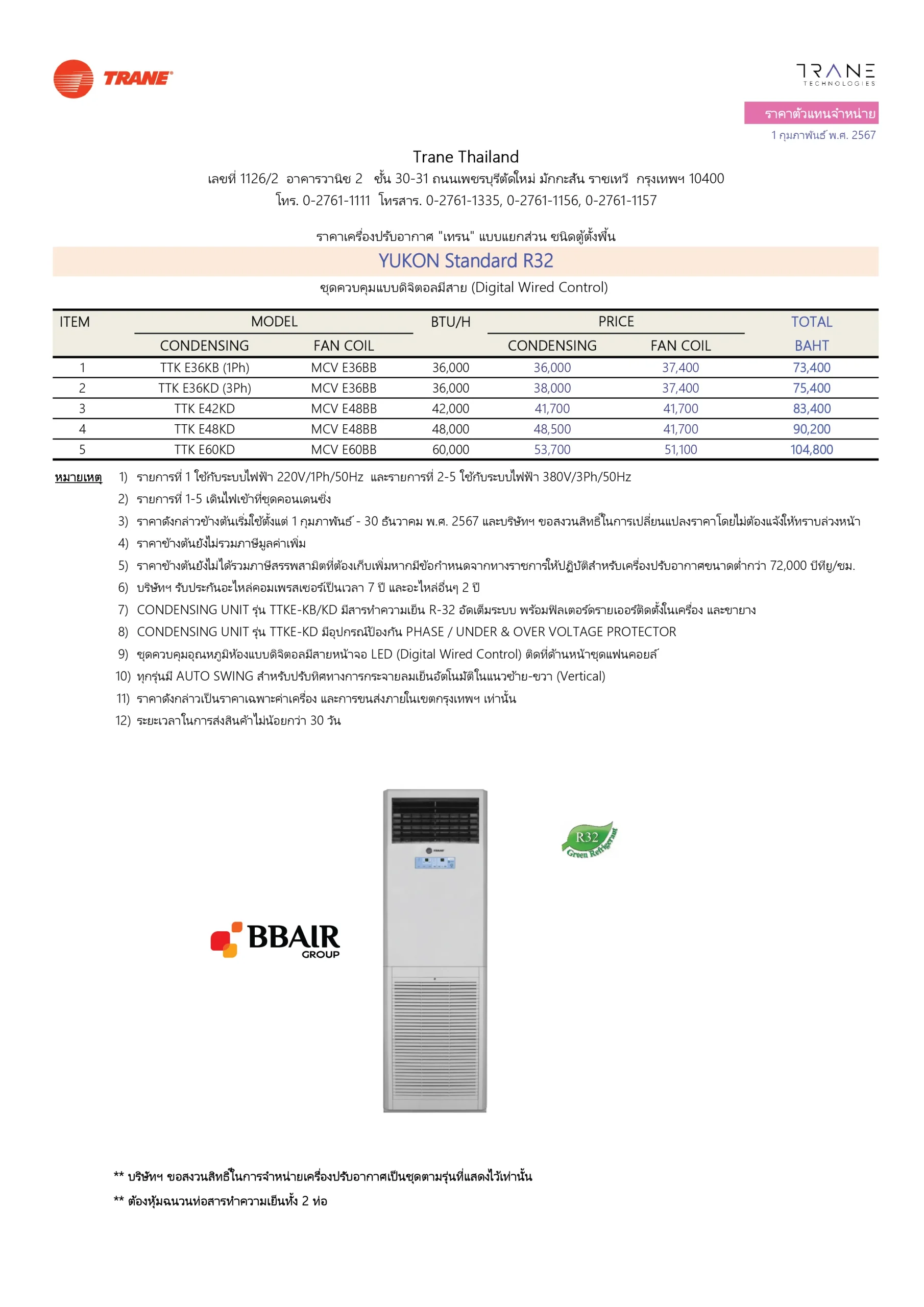 คุณสมบัติสินค้าของแอร์เทรน แบบตู้ตั้งพื้น YUKON STANDARD R-32 SERIES น้ำยาแอร์ R-32